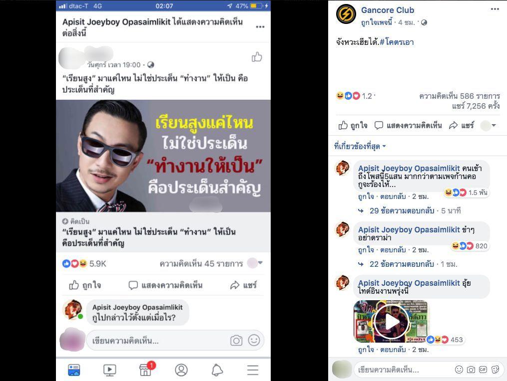จากนั้นเพจ Gancore Club ก็ได้แคปภาพแล้วนำไปโพสต์ในเพจพร้อมด้วยข้อความว่า “จังหวะเฮียได้ #โคตรเอา” ก่อนที่ โจอี้ บอย จะเข้าไปคอมเมนต์ตอบกลับว่า “คนเข้าถึงโพสต์นี้ 5 แสน มากกว่าตามเพจก้านคอ กูจะร้องไห้...” ก่อนจะคอมเมนต์เพิ่มเติมว่า “ขำๆ อย่าดราม่า” และโพสต์คลิปวิดีโอโปรโมตคอนเสิร์ตของตัวเองที่จะจัดขึ้นในวันพรุ่งนี้ (22 ธ.ค. 2561) งานนี้แฟนๆ เลยเข้ามาคอมเมนต์แซวกันใหญ่ บ้างก็บอกว่าเหมือนเอาแอดมินเพจดังกล่าวมาตบกลางห้าแยกลาดพร้าวด้วย.