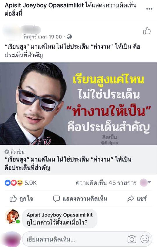ล่าสุดแร็ปเปอร์ดัง โจอี้ บอย ก็เจอเพจหนึ่งนำภาพไปตัดต่อแล้วใส่คำคมว่า “เรียนสูงแค่ไหนไม่ใช่ประเด็น ทำงานให้เป็นคือประเด็นสำคัญ” งานนี้เจ้าตัวเลยเข้าไปคอมเมนต์ตอบกลับสั้นๆ แต่พีคไปอีกว่า “กูไปกล่าวไว้ตั้งแต่เมื่อไร?”