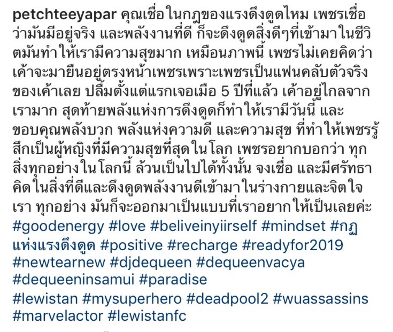 และขอบคุณพลังบวก พลังแห่งความดี และความสุข ที่ทำให้เพชรรู้สึกเป็นผู้หญิงที่มีความสุขที่สุดในโลก เพชรอยากบอกว่า ทุกสิ่งทุกอย่างในโลกนี้ ล้วนเป็นไปได้ทั้งนั้น จงเชื่อ และมีศรัทธา คิดในสิ่งที่ดีและดึงดูดพลังงานดีเข้ามาในร่างกายและจิตใจเรา ทุกอย่าง มันก็จะออกมาเป็นแบบที่เราอยากให้เป็นเลยค่ะ”