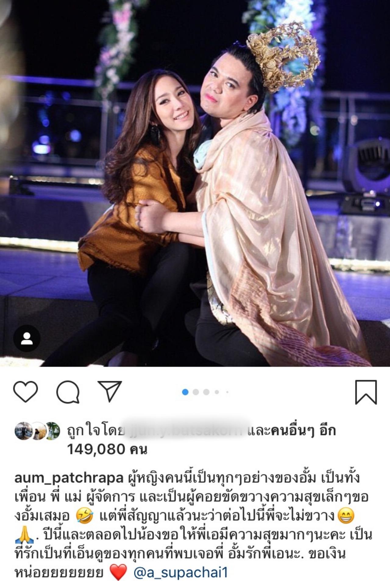 “ผู้หญิงคนนี้เป็นทุกๆ อย่างของอั้ม เป็นทั้งเพื่อน พี่ แม่ ผู้จัดการ และเป็นผู้คอยขัดขวางความสุขเล็กๆ ของอั้มเสมอ แต่พี่สัญญาแล้วนะว่าต่อไปนี้พี่จะไม่ขวาง ปีนี้และตลอดไปน้องขอให้พี่เอมีความสุขมากๆ นะคะ เป็นที่รักเป็นที่เอ็นดูของทุกคนที่พบเจอพี่ อั้มรักพี่เอนะ. ขอเงินหน่อยยยยยยย”