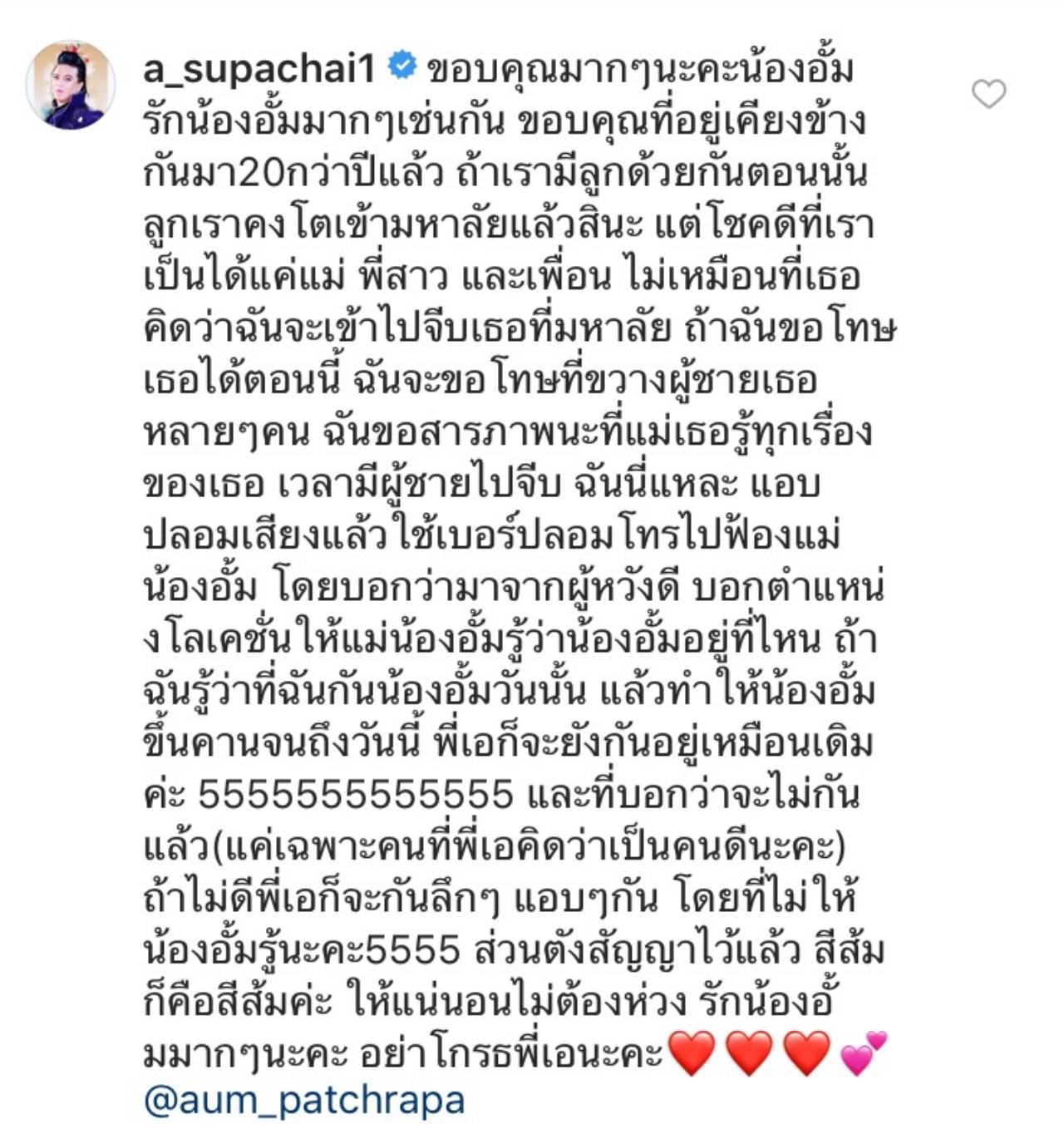 “ขอบคุณมากๆ นะคะน้องอั้ม รักน้องอั้มมากๆ เช่นกัน ขอบคุณที่อยู่เคียงข้างกันมา 20 กว่าปีแล้ว ถ้าเรามีลูกด้วยกันตอนนั้น ลูกเราคงโตเข้ามหา'ลัยแล้วสินะ แต่โชคดีที่เราเป็นได้แค่แม่ พี่สาว และเพื่อน ไม่เหมือนที่เธอคิดว่าฉันจะเข้าไปจีบเธอที่มหา'ลัย