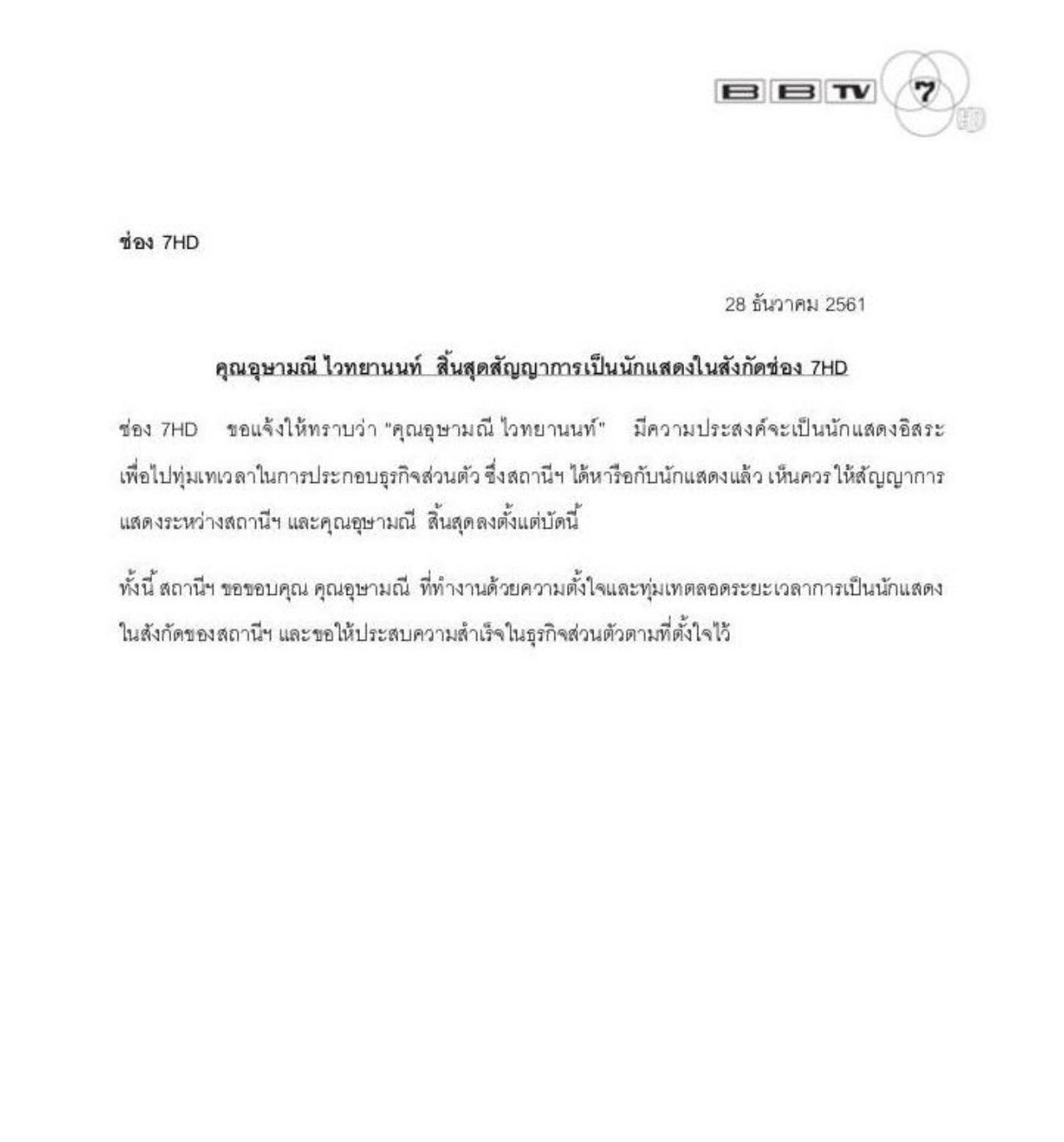ช่อง 7HD วันที่ 28 ธันวาคม 2561 คุณอุษามณี ไวทยานนท์ สิ้นสุดสัญญาการเป็นนักแสดงในสังกัดช่อง 7HD ช่อง 7 HD ขอแจ้งให้ทราบว่า คุณอุษามณี ไวทยานนท์ มีความประสงค์จะเป็นนักแสดงอิสระเพื่อไปทุ่มเทเวลาในการประกอบธุรกิจส่วนตัว ซึ่งสถานีฯ ได้หารือกับนักแสดงแล้ว เห็นควรให้สัญญาการแสดงระหว่างสถานีฯ และคุณอุษามณี สิ้นสุดลงตั้งแต่บัดนี้