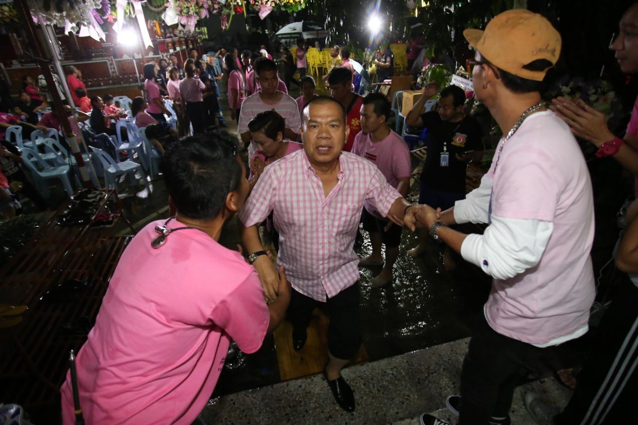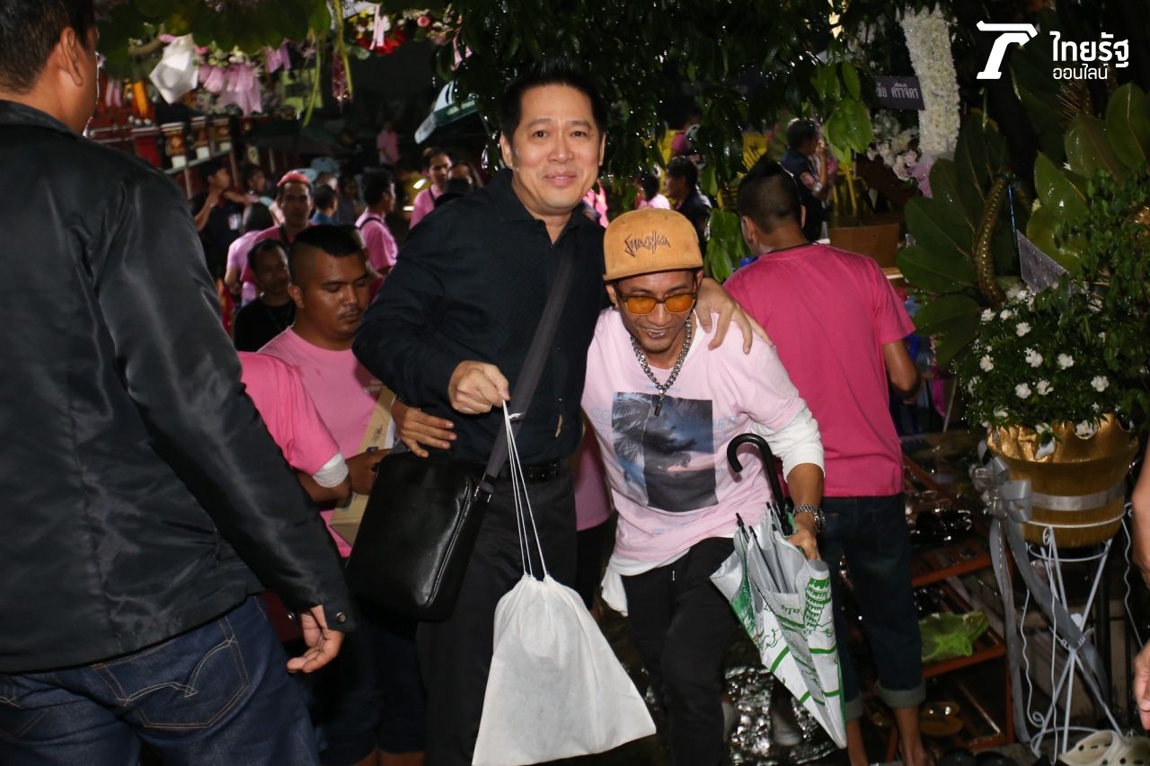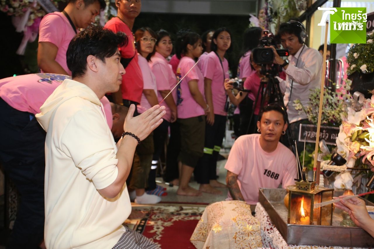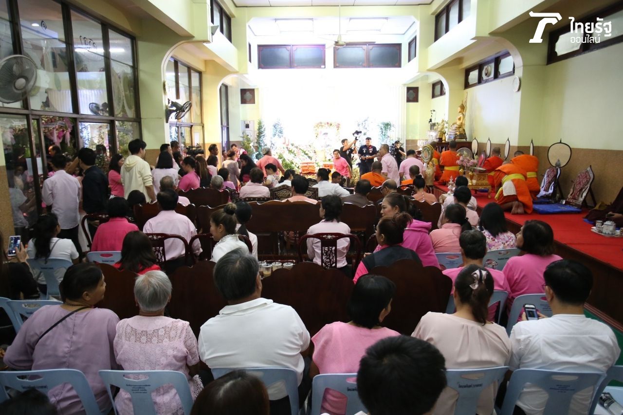 ซึ่งลูกๆ ของ พ่อดม รวมถึงแขกที่มาร่วมงานต่างก็ใส่เสื้อสีชมพูมากันเป็นจำนวนมาก สีหน้าทุกคนต่างก็ยิ้มแย้ม ตามประสงค์ที่ พ่อดม เคยบอกว่าไม่อยากให้เศร้า