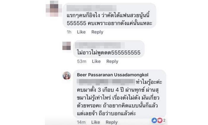 เรื่องเกิดขึ้นก็ตอนที่สาวเบียร์โพสต์ภาพคู่กับฮายเพื่ออวยพรวันเกิดของฮายในเฟซบุ๊กส่วนตัวและเขียนข้อความว่า “มีความสุขมากๆนะคะ ปี๋ เอ็งมันน่ารัก ชอบเต้นให้ดู ทำหน้าเคลิ้มได้กวนมากๆ ไอเบื๊อกกกก” และมีชาวเน็ตบางคนเข้ามาคอมเมนต์ว่า “แรกๆ คนก็อิจไง ว่าคัตได้แฟนสวยนู้นนี้ 555555 คบเพราะอยากดังเท่านั้นแหละ” งานนี้เจ้าตัวทนไม่ไหว โพสต์ข้อความตอบกลับความคิดเห็นนั้นว่า “ทำไมรู้อะคะ คบมาตั้ง 3 เกือบ 4 ปี ผ่านทุกข์ ผ่านสุขมาไม่รู้เท่าไหร่ เรื่องดังไม่ดัง มันเกี่ยวด้วยเหรอคะ ถ้าอยากคิดแบบนั้นก็แล้วแต่จ้า ถือว่าบอกแล้วค่ะ”