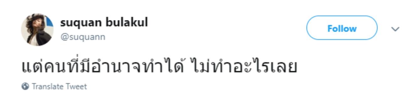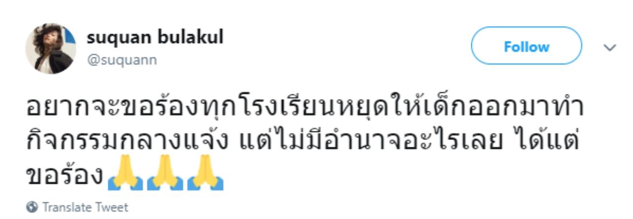 และนอกจากนี้สู่ขวัญยังได้โพสต์ข้อความลงในทวิตเตอร์ส่วนตัวว่า “อยากจะขอร้องทุกโรงเรียนหยุดให้เด็กออกมาทำกิจกรรมกลางแจ้ง แต่ไม่มีอำนาจอะไรเลย ได้แต่ขอร้อง” และโพสต์อีกข้อความว่า “แต่คนที่มีอำนาจทำได้ ไม่ทำอะไรเลย”