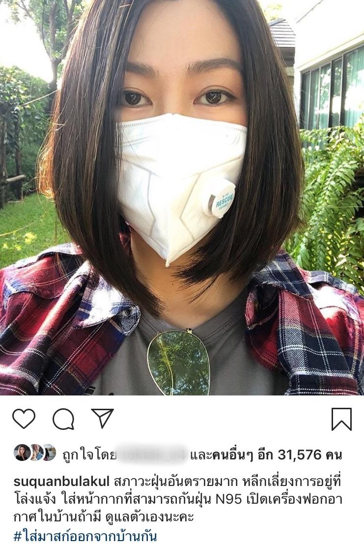 เพราะเหตุนี้จึงทำให้พิธีกรชื่อดัง สู่ขวัญ บูลกุล ได้โพสต์ข้อความระบายเรื่องดังกล่าว ลงในอินสตาแกรมส่วนตัวของตนเองว่า “สภาวะฝุ่นอันตรายมาก หลีกเลี่ยงการอยู่ที่โล่งแจ้ง ใส่หน้ากากที่สามารถกันฝุ่น N95 เปิดเครื่องฟอกอากาศในบ้านถ้ามี ดูแลตัวเองนะคะ”