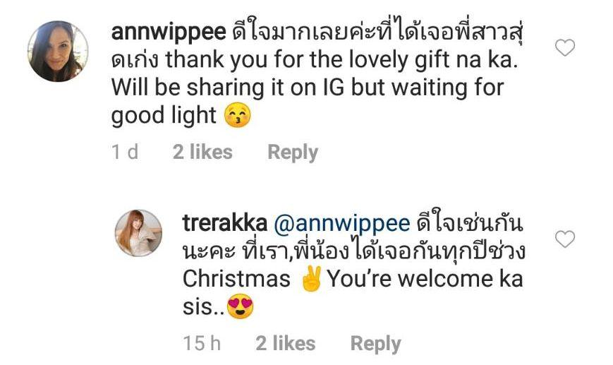 ด้าน แอนเดรีย ก็ได้เข้ามาคอมเมนต์ว่า “ดีใจมากเลยค่ะที่ได้เจอพี่สาวสุดเก่ง thank you for the lovely gift na ka. Will be sharing it on IG but waiting for good light” และ บุ๋ม ได้ตอบกลับว่า “ดีใจเช่นกันนะคะ ที่เรา,พี่น้องได้เจอกันทุกปีช่วง Christmas You’re welcome ka sis..”