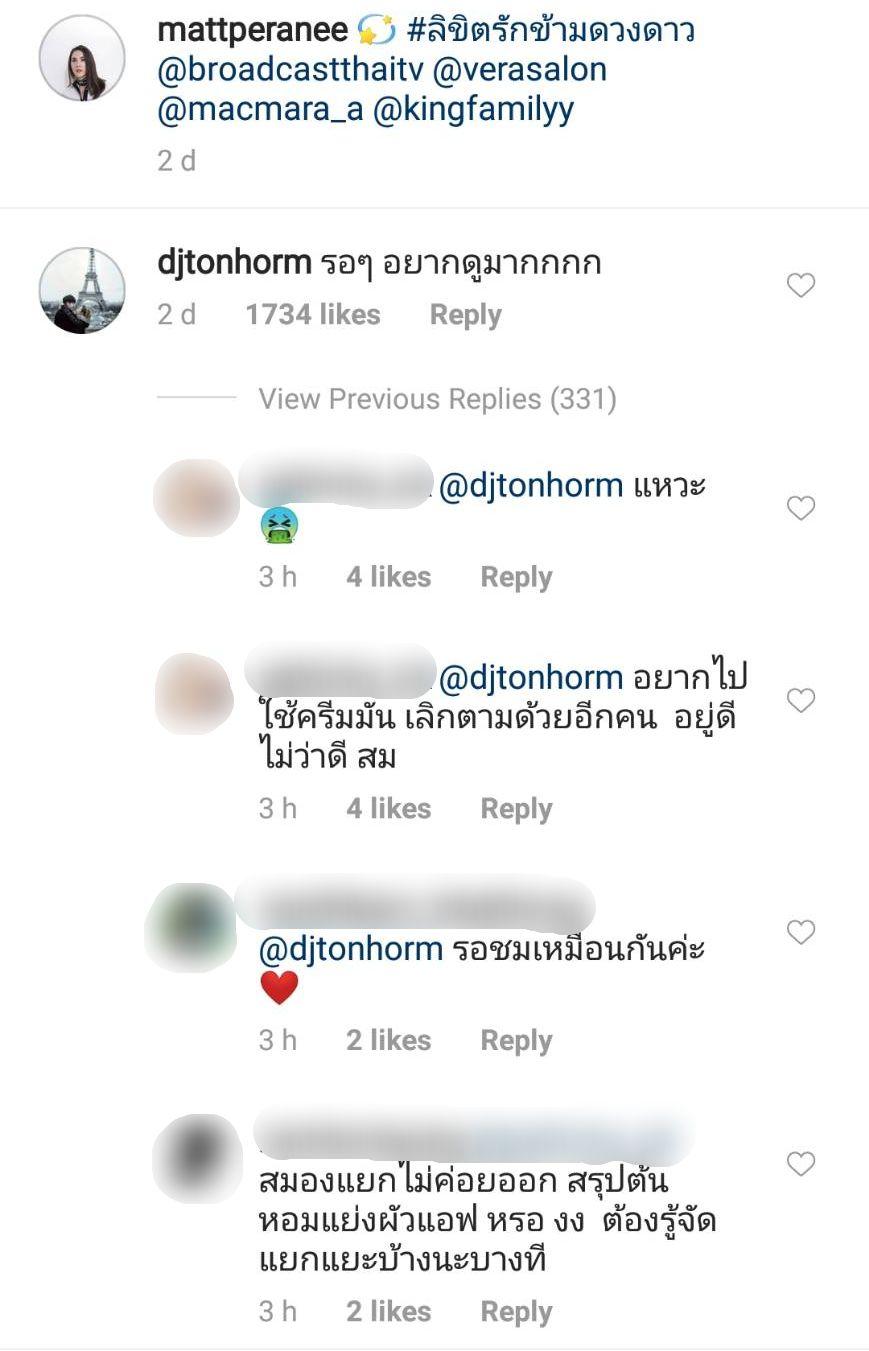 และเมื่อดีเจสาวแซ่บ ต้นหอม ศกุนตลา เข้ามาคอมเมนต์บอกว่า “รอๆ อยากดูมากกกก” กลับกลายเป็นว่ามีชาวโซเชียลฯ หลายคนเข้าไปรุมถล่มคอมเมนต์ว่าดีเจต้นหอม ทำนองว่าจะไม่ติดตามผลงานเช่นกัน และจะไม่อุดหนุนธุรกิจของเจ้าตัวด้วย แต่ก็มีชาวเน็ตอีกหลายคนที่เข้ามาโพสต์ให้กำลังใจต้นหอม พร้อมทั้งบอกให้อดทน และพูดถึงคนที่แอนตี้ว่าช่วยแยกแยะด้วย ทำแบบนี้เกินไปรึเปล่า และรู้สึกสงสารทั้งแมทและต้นหอมจริงๆ ที่ต้องเจอเรื่องแบบนี้.