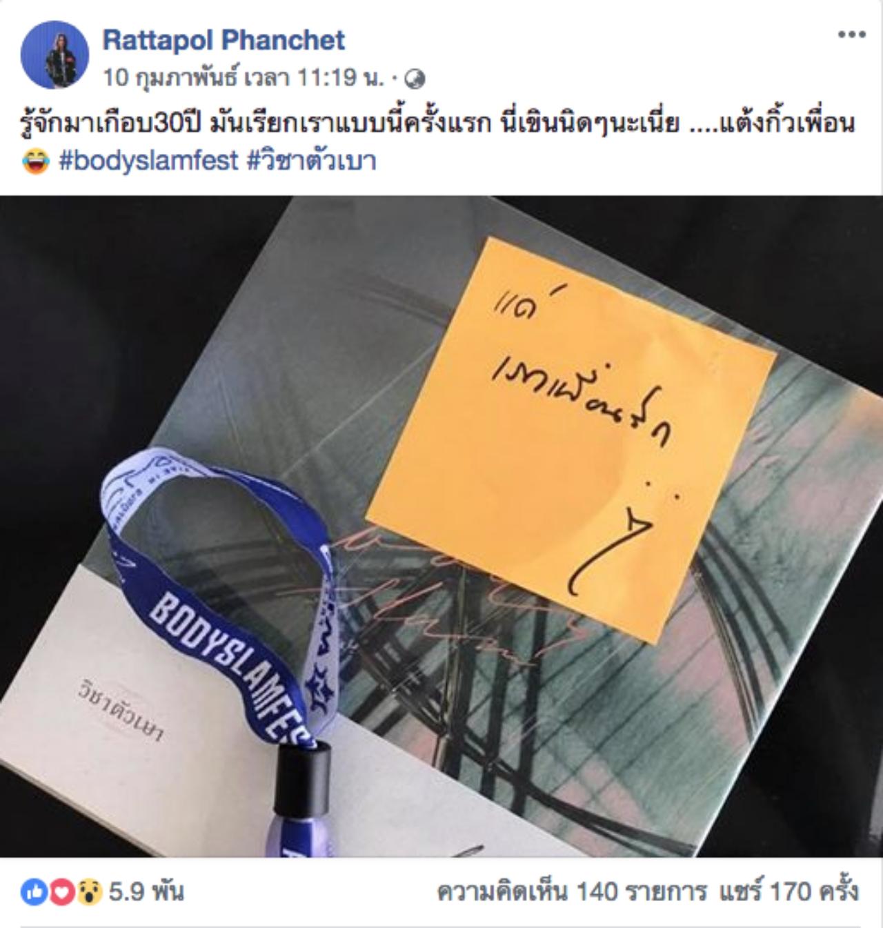 และนอกจากนี้หนุ่มเภายังได้โพสต์รูปและข้อความเพิ่มอีกว่า "รู้จักมาเกือบ30ปี มันเรียกเราแบบนี้ครั้งแรก นี่เขินนิดๆนะเนี่ย ....แต้งกิ้วเพื่อน.