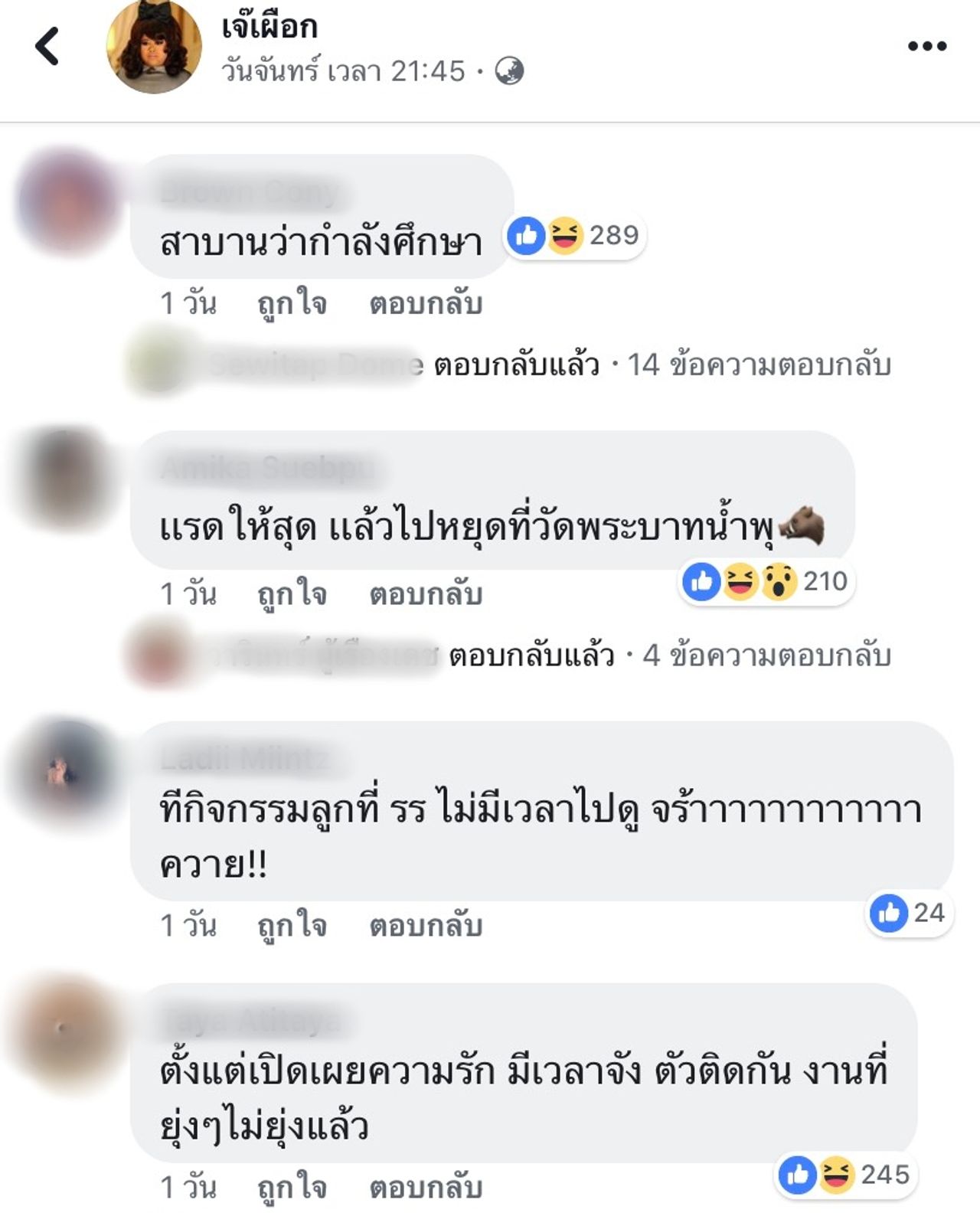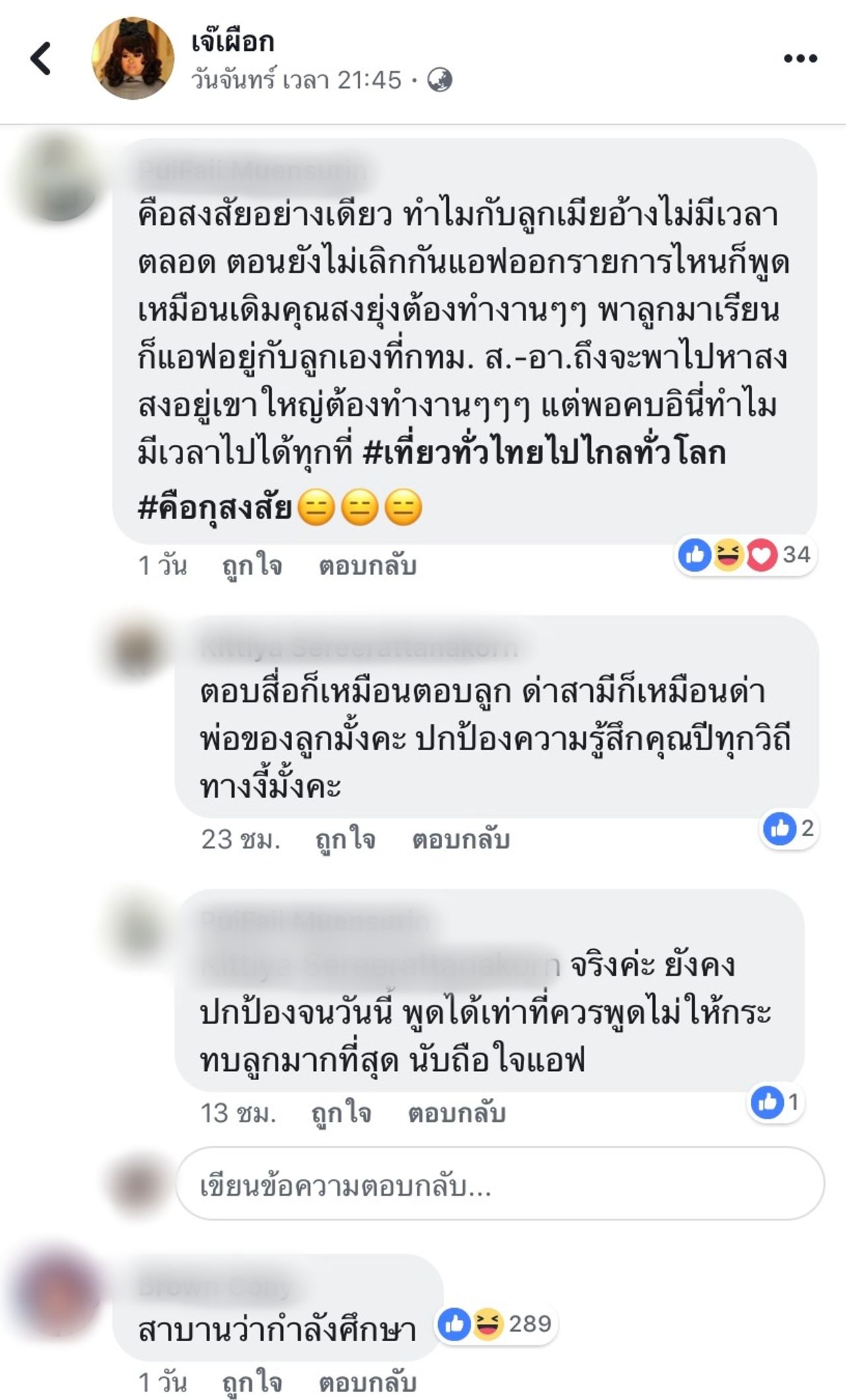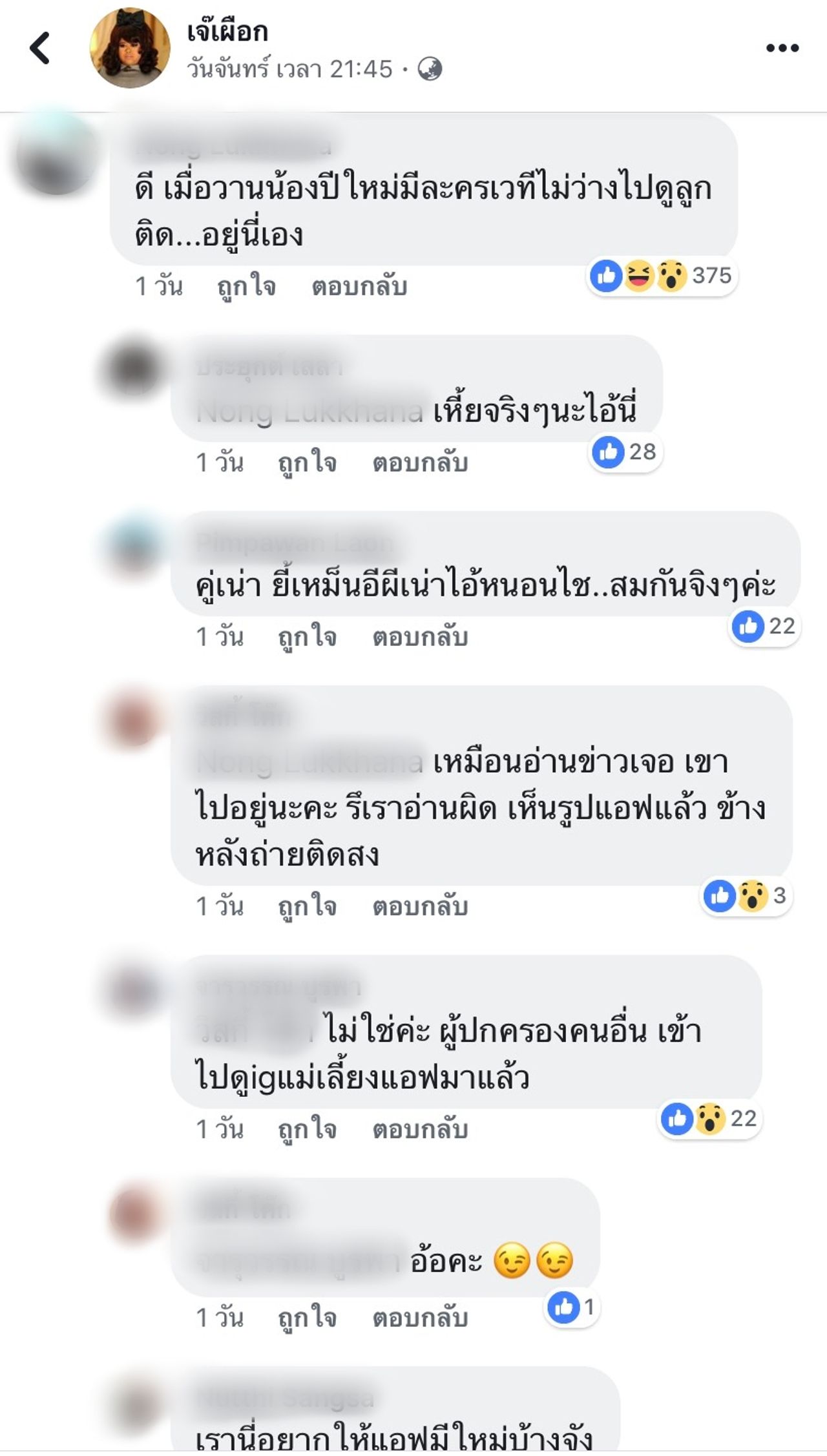 “ดี เมื่อวานน้องปีใหม่มีละครเวทีไม่ว่างไปดูลูก ติด...อยู่นี่เอง” แต่ก็มีชาวเน็ตอีกคนเข้ามาคอมเมนต์ต่อว่า “เหมือนอ่านข่าวเจอ เขาไปอยู่นะคะ รึเราอ่านผิด เห็นรูปแอฟแล้ว ข้างหลังถ่ายติดสง” และก็มีชาวเน็ตเข้ามาคอมเมนต์ต่ออีกว่า “ไม่ใช่ค่ะ ผู้ปกครองคนอื่น เข้าไปดูigแม่เลี้ยงแอฟมาแล้ว”