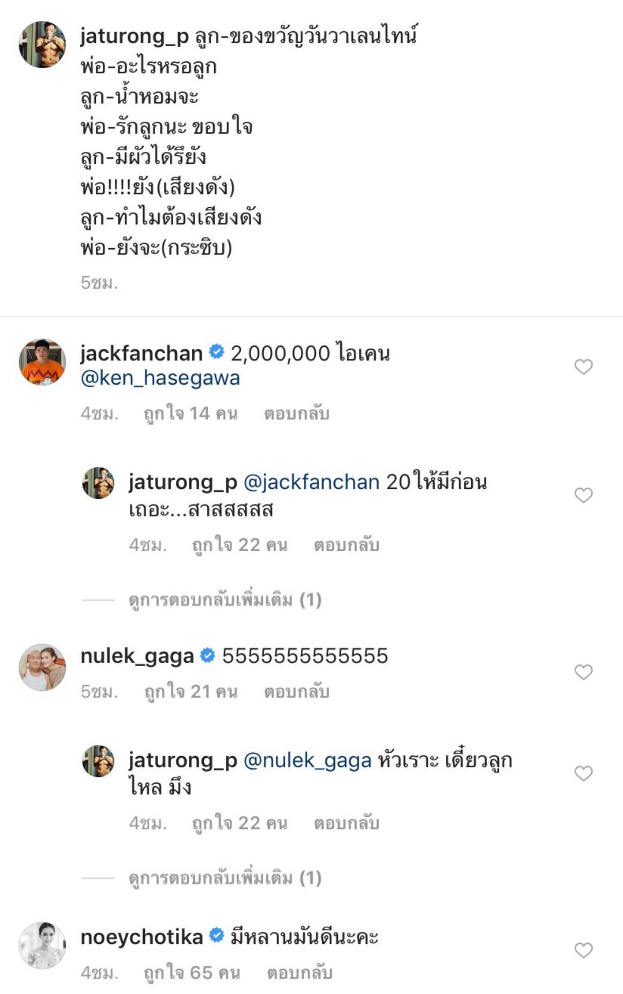 ซึ่งหลังจากที่โพสต์ข้อความไป แจ๊ค แฟนฉัน ก็ได้เข้ามาคอมเมนต์ว่า “2,000,000 ไอเคน” งานนี้จตุรงค์ก็เข้ามาตอบว่า “20 ให้มีก่อนเถอะ” ด้านนักแสดงตลก หนูเล็ก ก่อนบ่ายฯ ก็เข้ามาคอมเมนต์ว่า “555555555555” จตุรงค์ตอบกลับว่า “หัวเราะ เดี๋ยวลูกไหล” และ เนย โชติกา นางร้ายลูกหนึ่ง ก็ได้คอมเมนต์ว่า “มีหลานมันดีนะคะ”