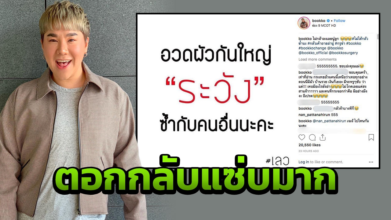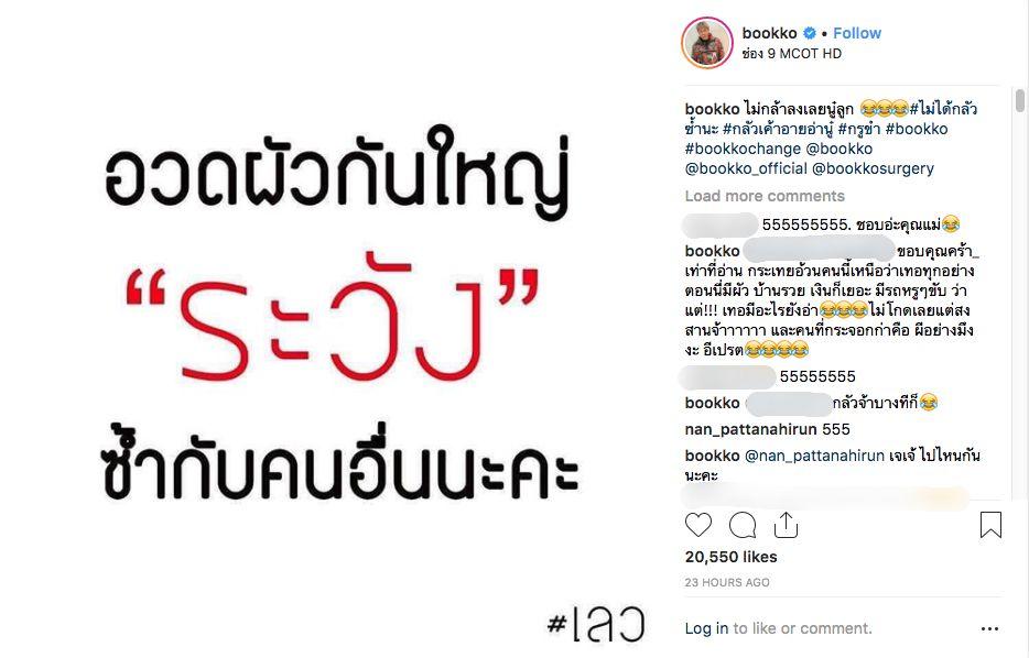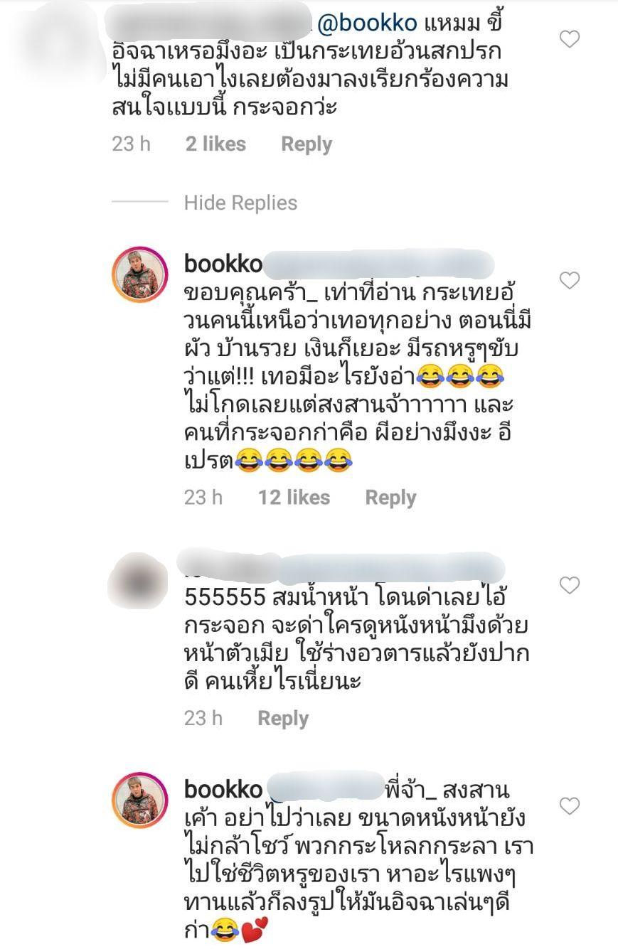หลังจากนั้นก็มีผู้ใช้ไอจีอีกคนมาช่วยว่าคนที่เข้ามาด่าบุ๊กโกะในไอจีด้วย และบุ๊กโกะคอมเมนต์ตอบว่า “ พี่จ้า_ สงสารเค้า อย่าไปว่าเลย ขนาดหนังหน้ายังไม่กล้าโชว์ พวกกะโหลกกะลา เราไปใช้ชีวิตหรูของเรา หาอะไรแพงๆ ทานแล้วก็ลงรูปให้มันอิจฉาเล่นๆ ดีก่า” เรียกว่าตอกกลับได้แซ่บสุดๆ สมเป็นดีเจบุ๊กโกะจริงๆ.