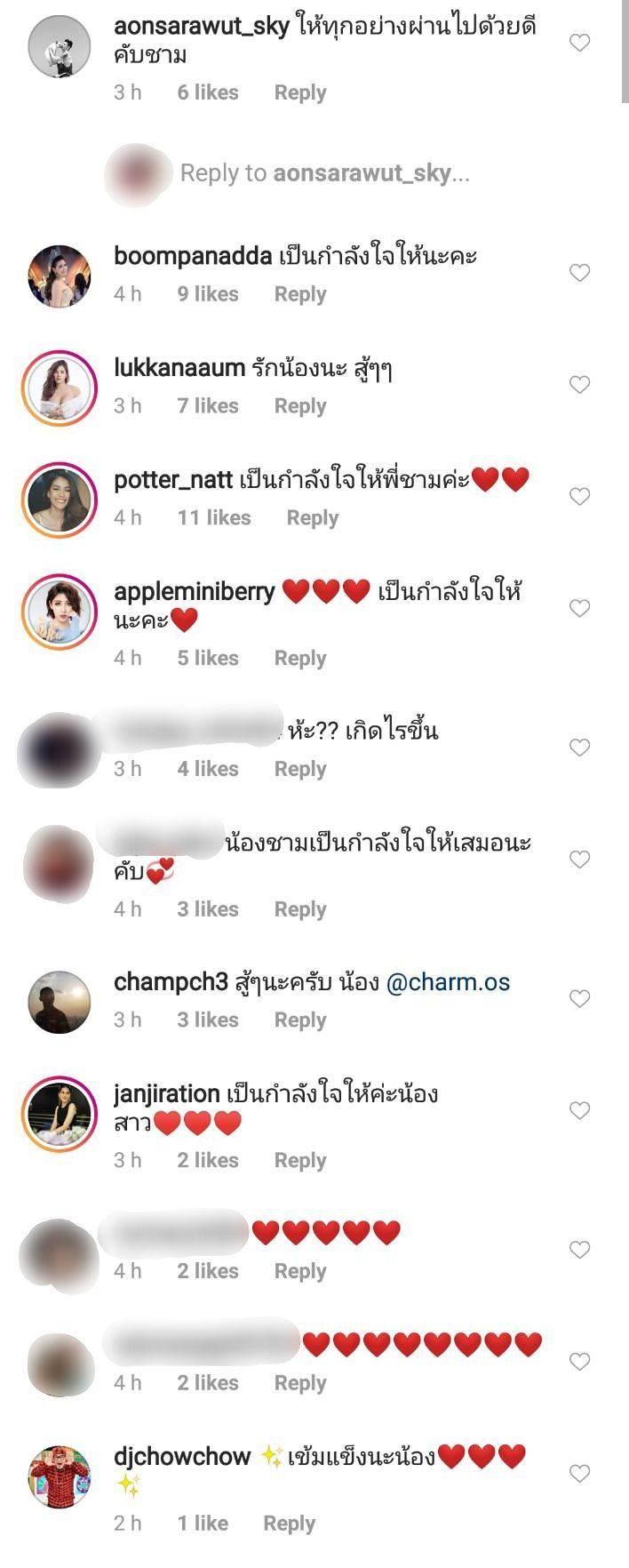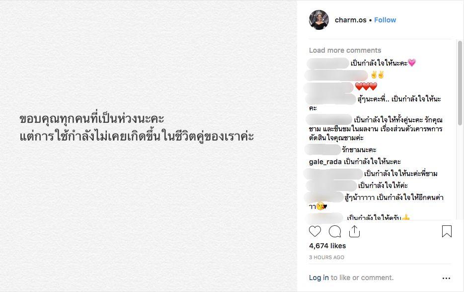 แต่แฟนๆ หลายคนก็ยังอดเป็นห่วงเจ้าตัวไม่ได้ เข้ามาโพสต์ข้อความให้กำลังใจเจ้าตัวในไอจีเป็นจำนวนมาก งานนี้ชามเลยโพสต์ภาพข้อความในไอจีสั้นๆ ว่า “ขอบคุณที่เป็นห่วงนะคะ แต่การใช้กำลังไม่เคยเกิดขึ้นในชีวิตคู่ของเราค่ะ” ซึ่งนอกจากจะมีแฟนๆ มาส่งกำลังใจให้เจ้าตัวอย่างล้นหลามแล้ว ยังมีเหล่าคนดังในวงการบันเทิง อาทิ บุ๋ม ปนัดดา, อุ้ม ลักขณา, แนท อนิพรณ์, แอปเปิ้ล สีสะเหงียน, อ้น สราวุธ, ดีเจเชาเชา, เกล รดา ฯลฯ เข้ามาโพสต์ให้กำลังใจด้วย