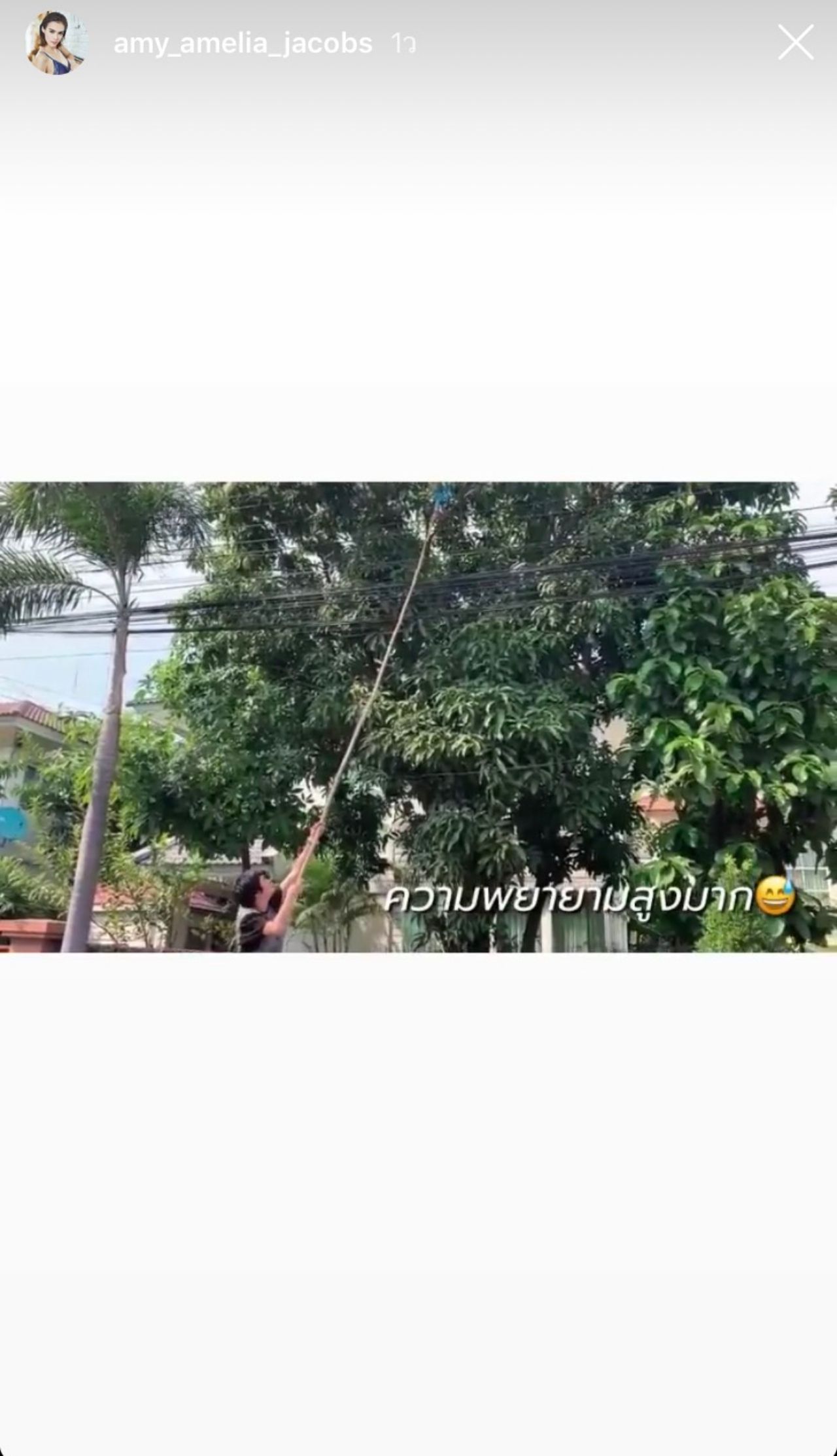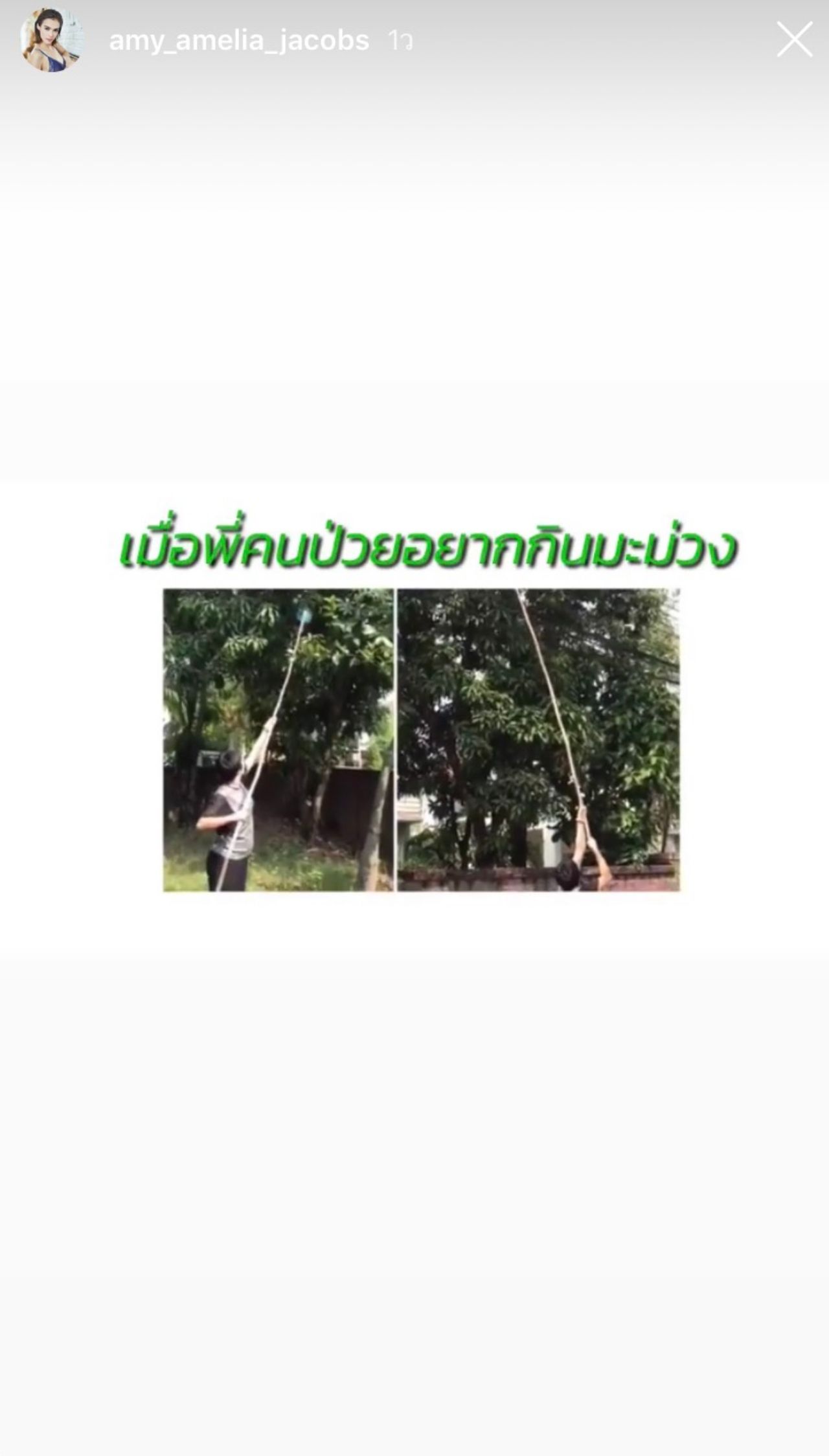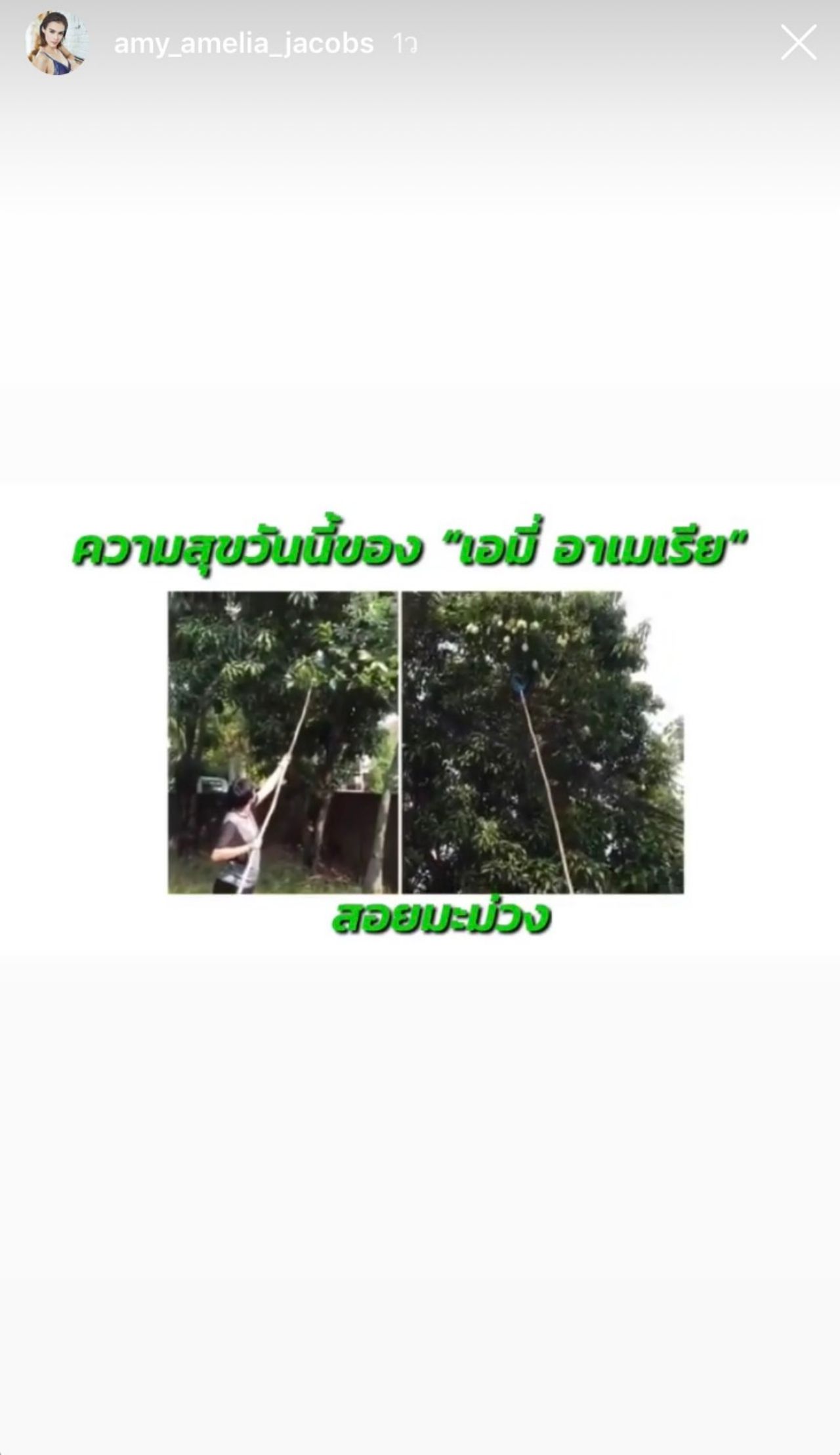 แต่ล่าสุด เจ้าตัวได้โพสต์คลิปลงในไอจีสตอรี่อีกครั้ง โดยเป็นคลิปสั้นๆ จำนวน 4 คลิป เป็นคลิปที่เจ้าตัวกำลังใช้ความพยายามในการสอยมะม่วง พร้อมกับเขียนแคปชั่นว่า “ความสุขวันนี้ของเอมี่ อาเมเรีย สอยมะม่วง” ซึ่งคลิปนี้ก็ทำเอาแฟนๆ ที่ยังคงรักและคิดถึงสาวเอมี่ ดูแล้วต้องยิ้มตามไปกับความน่ารักของสาวเอมี่ ที่พยายามจะสอยมะม่วงจากต้นเอาลงมาให้ได้ ถึงจะยังไม่กลับมาเล่นละคร ก็อัพเดตชีวิตให้แฟนๆ ที่คิดถึงได้ติดตามก็ได้นะจ๊ะสาวเอมี่