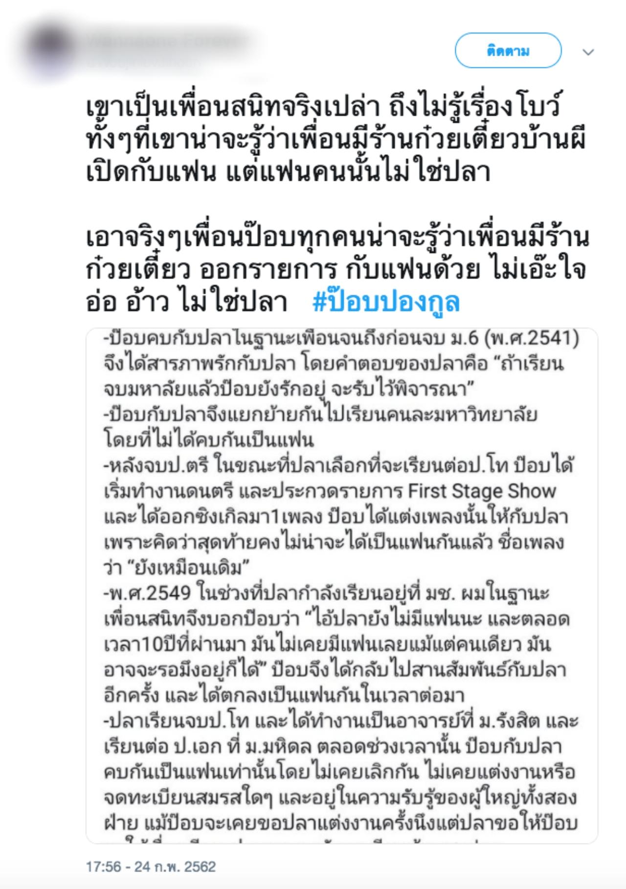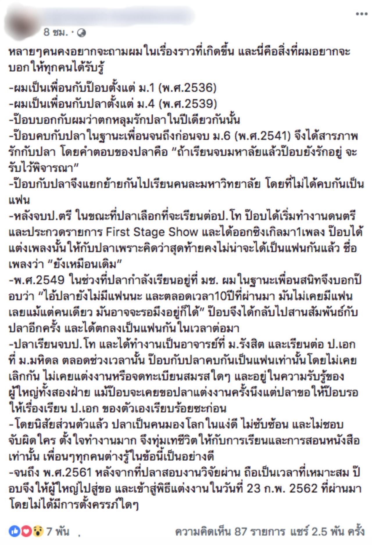 ล่าสุดมีชาวเน็ตที่อ้างตัวว่าเป็นเพื่อนสนิทของหนุ่มป๊อบ ซึ่งได้เล่ารายละเอียดความสัมพันธ์ตั้งแต่สมัยเรียนยันจบมหาวิทยาลัยระหว่างปลา และป๊อบ ปองกูล โดยมีข้อความว่า