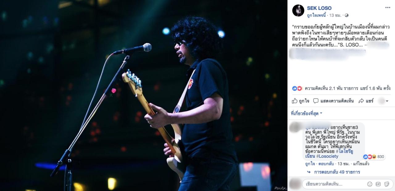 “กราบขออภัยผู้หลักผู้ใหญ่ในบ้านเมืองนี้ที่ผมกล่าวพาดพิงถึงในทางเสียๆ หายๆ เมื่อหลายเดือนก่อน ถือว่ายกโทษให้คนบ้าที่จะกลับตัวกลับใจเป็นคนดีคนนึงก็แล้วกันนะครับ...”S. LOSO...” หลังจากที่เสกโพสต์ข้อความขอโทษนี้ไปก็มีแฟนๆ เข้ามาคอมเมนต์ให้ความชื่นชมพร้อมกับให้กำลังใจนักร้องหนุ่มมากมายที่ทำผิดแล้วรู้จักเอ่ยคำขอโทษ