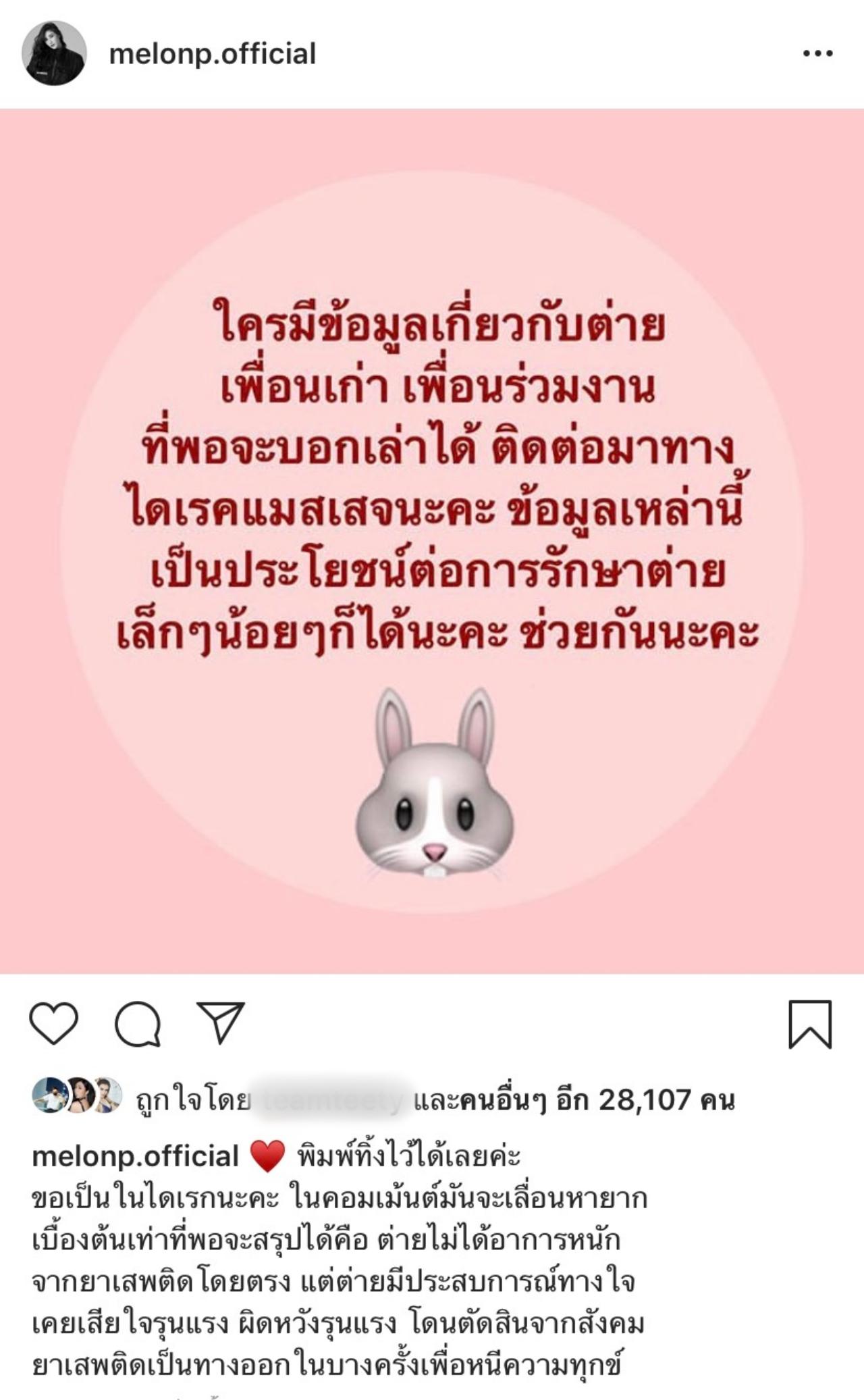 โดยสาวแตงโมโพสต์ข้อความลงในอินสตาแกรมตัวเองว่า “ใครมีข้อมูลเกี่ยวกับต่ายเพื่อนเก่า เพื่อนร่วมงาน ที่พอจะบอกเล่าได้ ติดต่อมาทางไดเรคแมสเสจนะคะ ข้อมูลเหล่านี้เป็นประโยชน์ต่อการรักษาต่าย เล็กๆ น้อยๆ ก็ได้นะคะ ช่วยกันนะคะ”