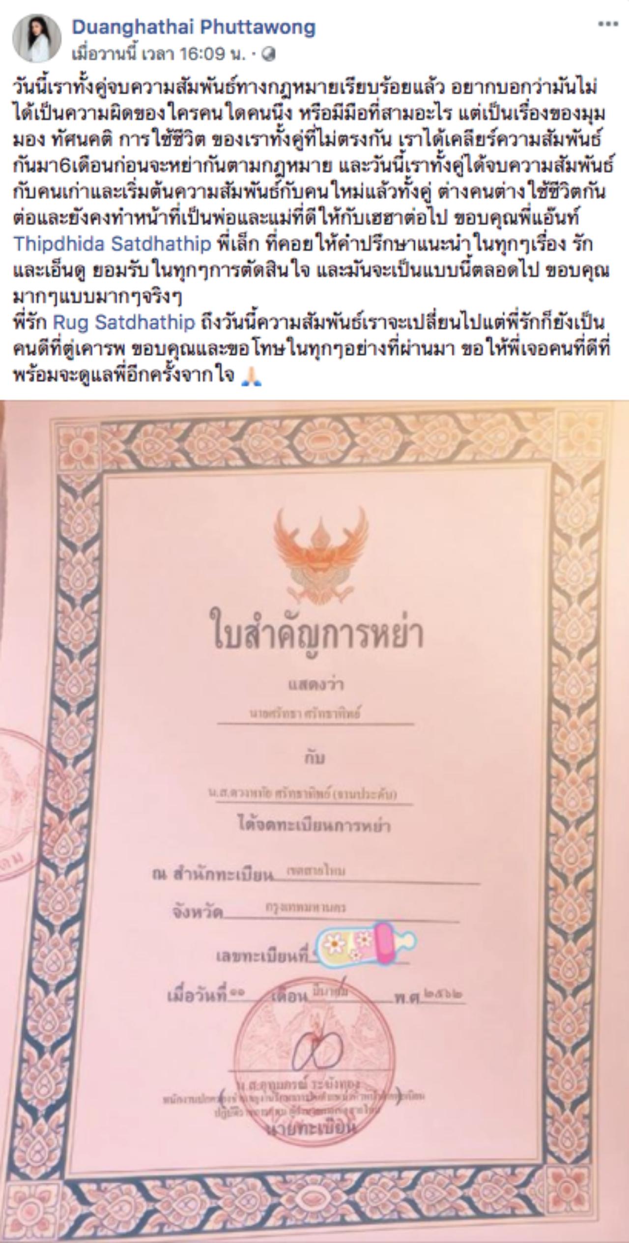 ทำเอาหลายคนตกใจไปตามๆ กัน เมื่อ ครูรัก ศรัทธา ศรัทธาทิพย์ นักแสดง ผู้กำกับ และอดีตครูบ้านเอเอฟ ได้โพสต์ข้อความผ่านเฟซบุ๊กประกาศหย่าภรรยาสาว ตู่ ดวงฤทัย ที่อายุห่างกัน 24 ปี