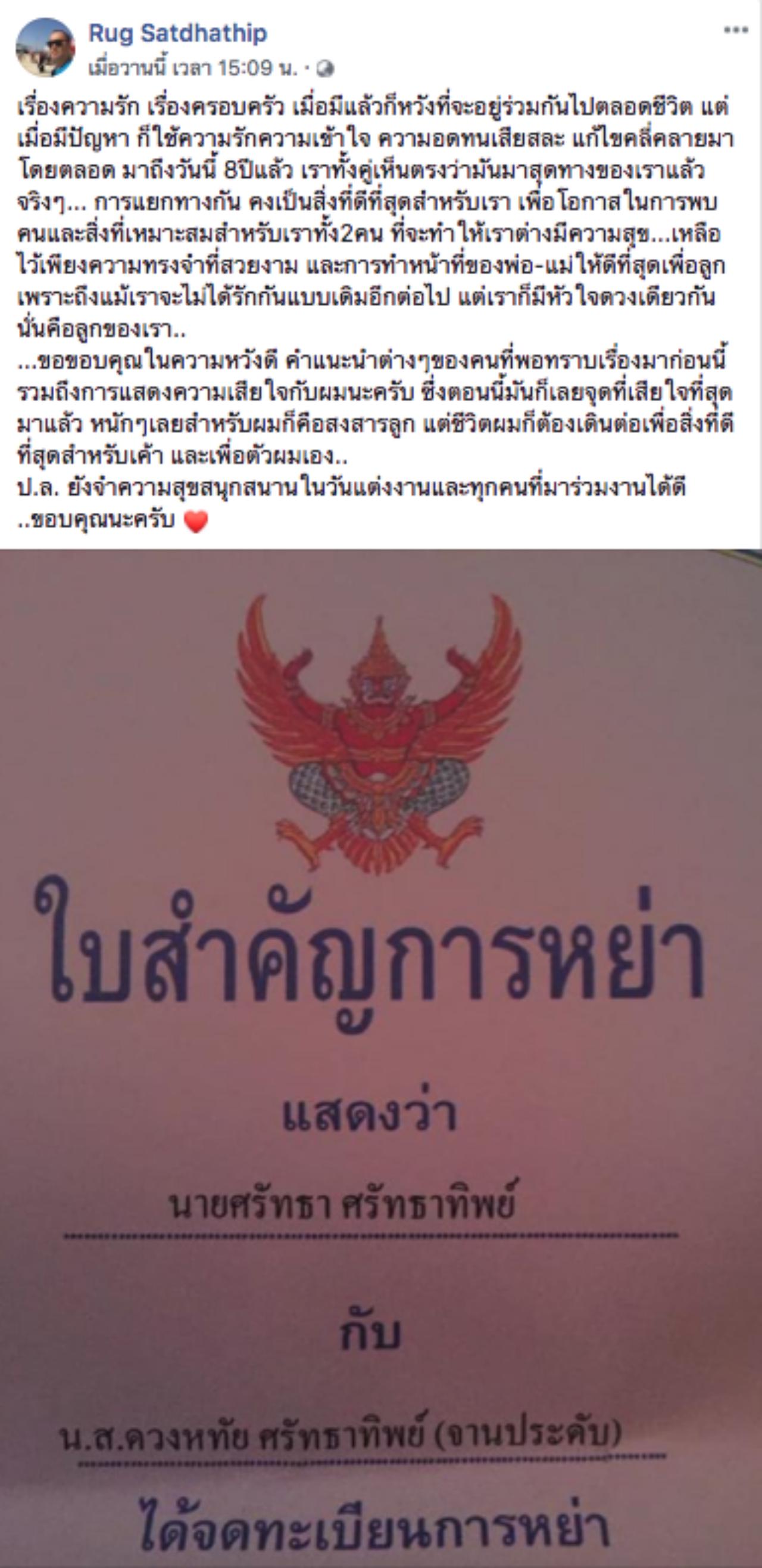 มาถึงวันนี้ 8 ปีแล้ว เราทั้งคู่เห็นตรงว่ามันมาสุดทางของเราแล้วจริงๆ... การแยกทางกัน คงเป็นสิ่งที่ดีที่สุดสำหรับเรา เพื่อโอกาสในการพบคนและสิ่งที่เหมาะสมสำหรับเราทั้ง 2 คน ที่จะทำให้เราต่างมีความสุข...