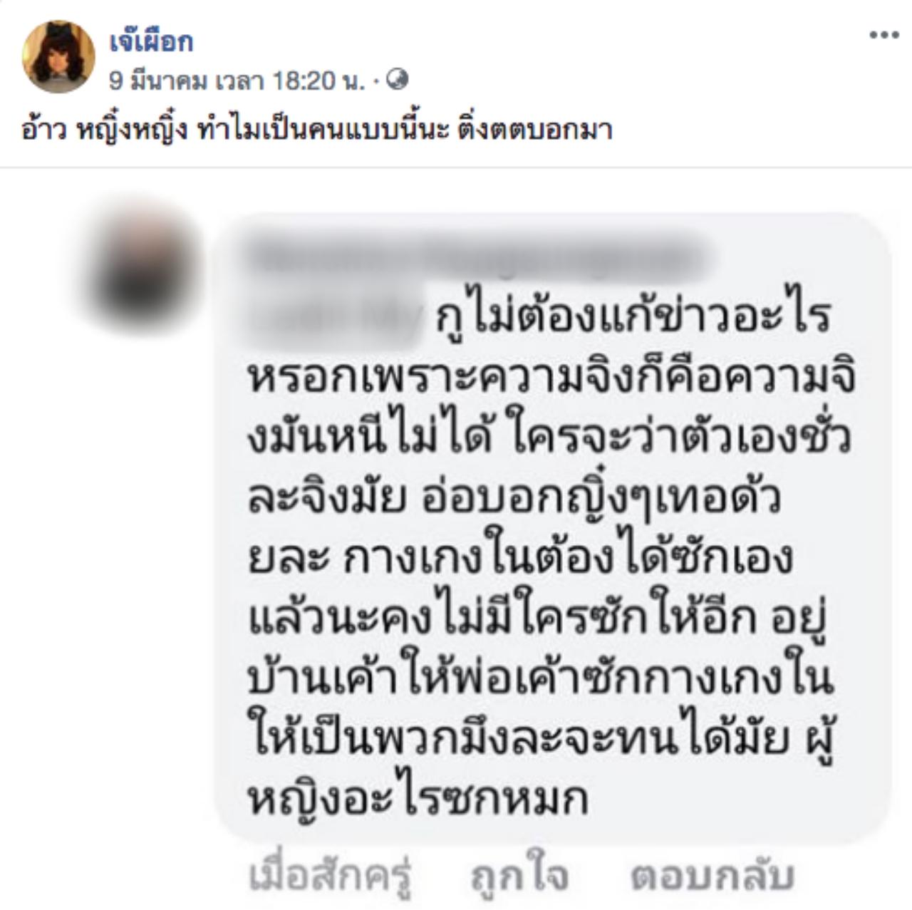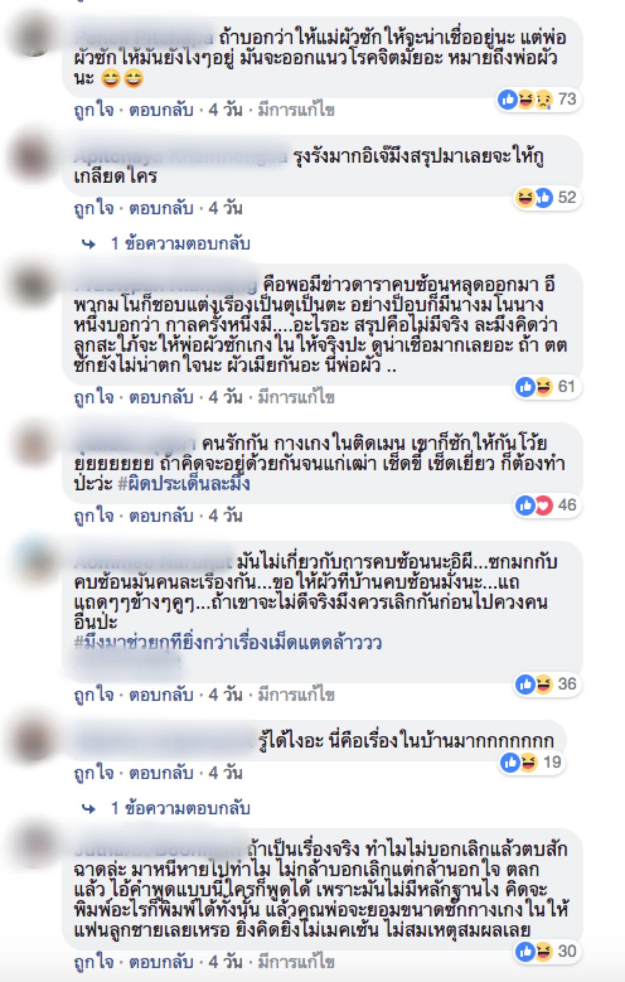 ซึ่งหลังจากที่หญิงสาวคนดังกล่าวได้คอมเมนต์แฉ ก็มีชาวเน็ตอีกมากมายเข้ามาคอมเมนต์ตอบกลับ โดยไม่มีใครเชื่อในเรื่องที่หญิงสาวคนดังกล่าวแฉ พร้อมทั้งบอกว่าอย่าหลงประเด็น คบซ้อนก็คือคบซ้อน ไม่เกี่ยวกับเรื่องซกมก แล้วทำไมต้องเป็นพ่อของตูมตามที่เป็นคนซักกางเกงชั้นในให้กับอีกฝ่าย ถ้าบอกว่าเป็นแม่ของตูมตามซักให้ก็ยังจะพอเชื่อ