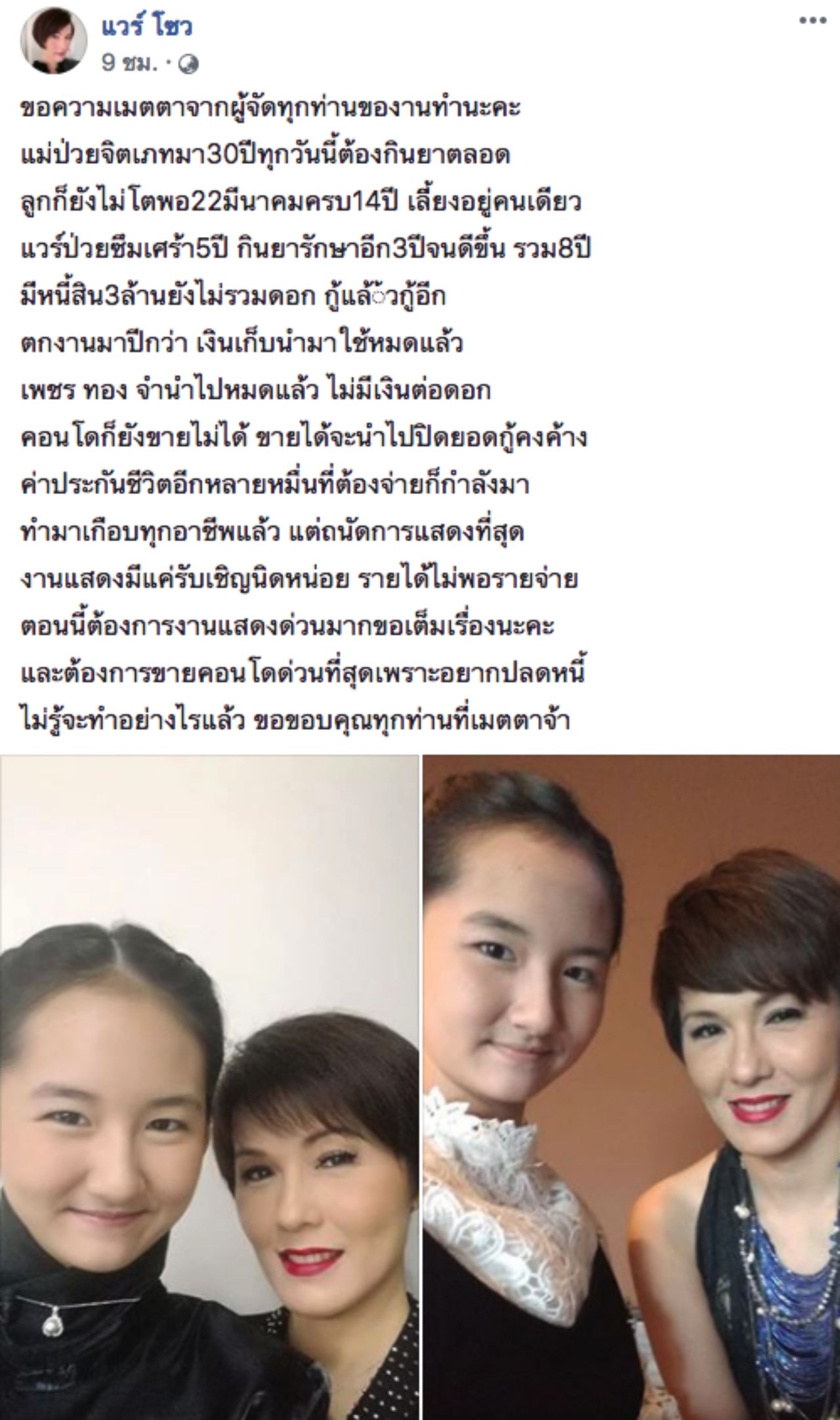 ล่าสุดเจ้าตัวก็ได้ตัดสินใจโพสต์เฟซบุ๊ก เพื่อขอความเมตตาจากผู้จัดละคร ของานทำ โดย แวร์ โซว บอกว่า ที่อยากทำงานแสดงนั้น เพราะเป็นสิ่งที่เธอถนัดมากที่สุด อีกทั้งยังติดหนี้ประมาณ 3 ล้านบาท
