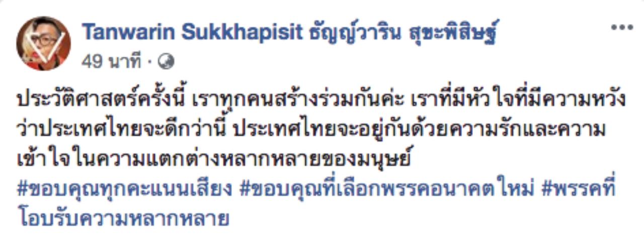 “ขอบคุณ ทุกคน ขอบคุณทุกคะแนนเสียง ขอบคุณทุกหัวใจที่เชื่อว่าประเทศไทยเราจะดีกว่าที่เป็นอยู่ได้ ขอบคุณความหวังของทุกคนที่เชื่อว่าเรายังอยากมีอนาคตใหม่ อนาคตที่ดีร่วมกัน ขอบคุณจากหัวใจกะเทยตัวน้อยๆ คนนี้ค่ะ กอล์ฟ ธัญญ์วาริน สุขะพิสิษฐ์ ผู้สมัครส.ส.แบบบัญชี รายชื่อลำดับที่ 9 #พรรคอนาคตใหม่ #พรรคที่เห็นคนไทยเท่ากัน”