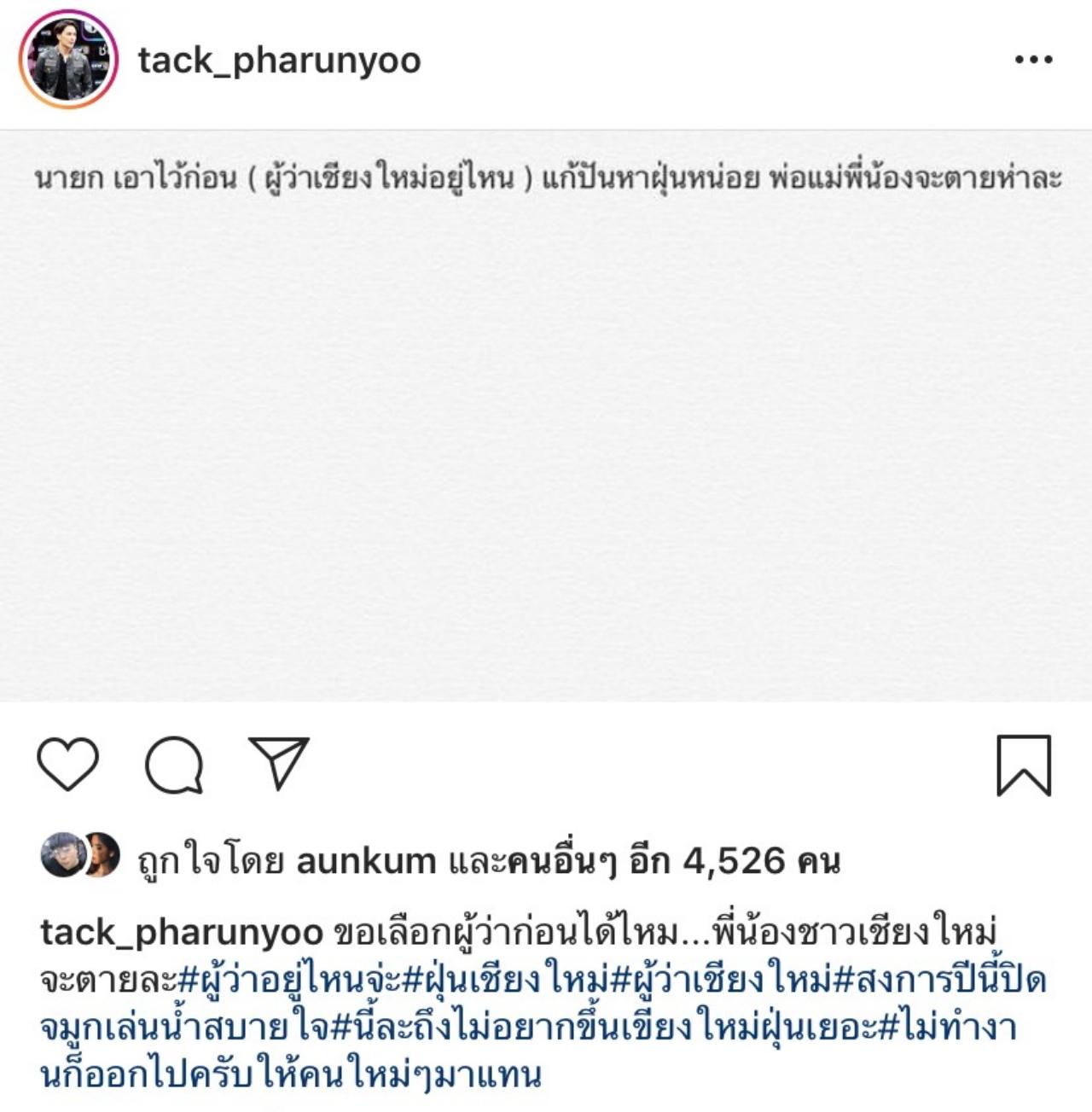 โดยหนุ่มแทคโพสต์ข้อความลงในอินสตาแกรมของตัวเองว่า “นายก เอาไว้ก่อน (ผู้ว่าฯเชียงใหม่อยู่ไหน) แก้ปัญหาฝุ่นหน่อย พ่อแม่พี่น้องจะตาย_่าละ” พร้อมแคปชั่นว่า “ขอเลือกผู้ว่าก่อนได้ไหม...พี่น้องชาวเชียงใหม่จะตายละ #ผู้ว่าอยู่ไหนจ่ะ #ฝุ่นเชียงใหม่ #สงการปีนี้ปิดจมูกเล่นน้ำสบายใจ #นี้ละถึงไม่อยากขึ้นเชียงใหม่ฝุ่นเยอะ #ไม่ทำงานก็ออกไปครับให้คนใหม่ๆ มาแทน”