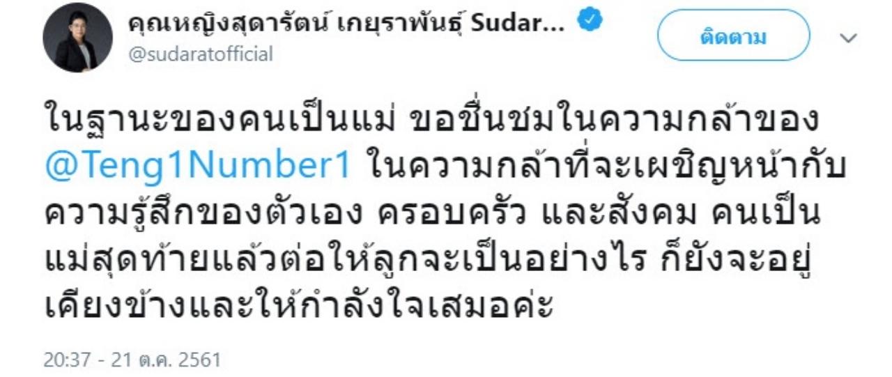 ซึ่งหลังจากที่เต็งหนึ่งเปิดเผยตัวตนไปแล้ว คุณหญิงสุดารัตน์ เกยุราพันธุ์ นักการเมืองชื่อดัง ที่เคยโพสต์ชื่นชมอดีตนักร้อง-นักแสดงผ่านทางโลกโซเชียลว่า “ในฐานะของคนเป็นแม่ ขอชื่นชมในความกล้าของ @Teng1Number1 ในความกล้าที่จะเผชิญหน้ากับความรู้สึกของตัวเอง ครอบครัว และสังคม คนเป็นแม่สุดท้ายแล้วต่อให้ลูกจะเป็นอย่างไร ก็ยังจะอยู่เคียงข้างและให้กำลังใจเสมอค่ะ”