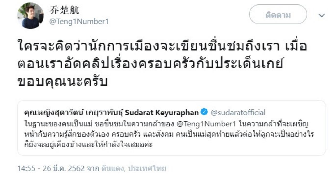 โดยหนุ่มเต็งหนึ่ง ได้โพสต์ข้อความของคุณหญิงสุดารัตน์มาแชร์อีกครั้ง พร้อมเผยความประทับใจที่มีต่อคุณหญิงว่า “ใครจะคิดว่านักการเมืองจะเขียนชื่นชมถึงเรา เมื่อตอนเราอัดคลิปเรื่องครอบครัวกับประเด็นเกย์ ขอบคุณนะครับ”