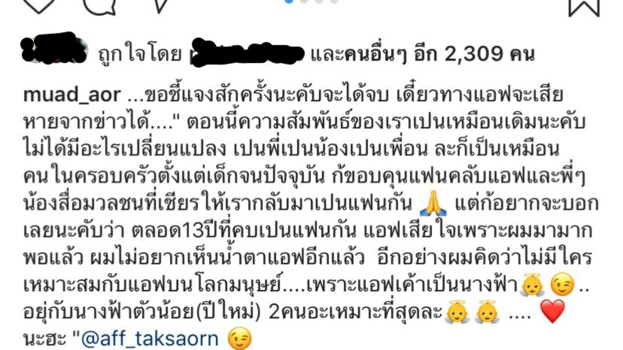 แต่ก็อยากจะบอกเลยนะคับว่า ตลอด 13 ปีที่คบเป็นแฟนกัน แอฟเสียใจเพราะผมมามากพอแล้ว ผมไม่อยากเห็นน้ำตาแอฟอีกแล้ว อีกอย่างผมคิดว่าไม่มีใครเหมาะสมกับแอฟบนโลกมนุษย์...เพราะแอฟเค้าเป็นนางฟ้า..อยู่กับนางฟ้าตัวน้อย(ปีใหม่) 2 คนอะเหม่ะที่สุดละ...นะฮะ”