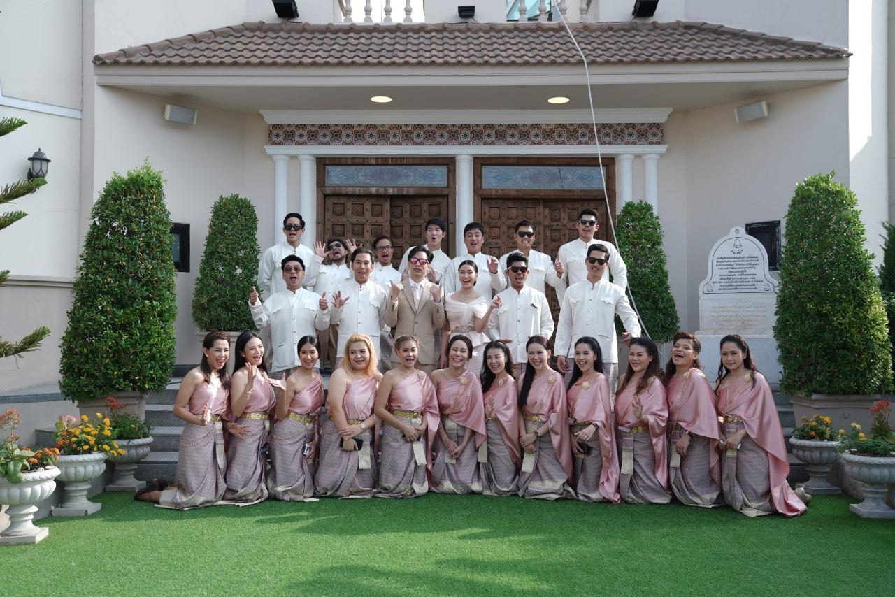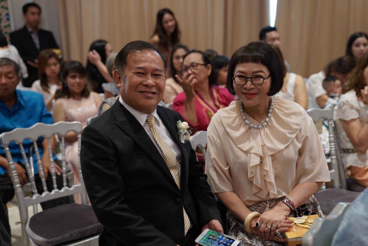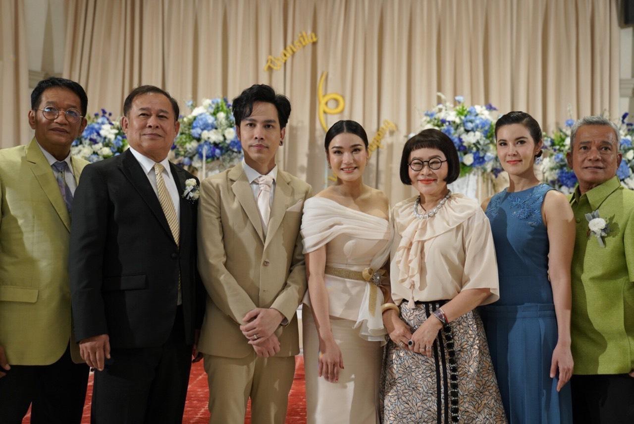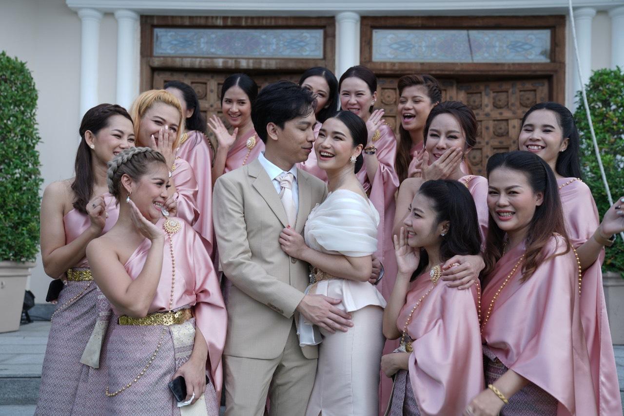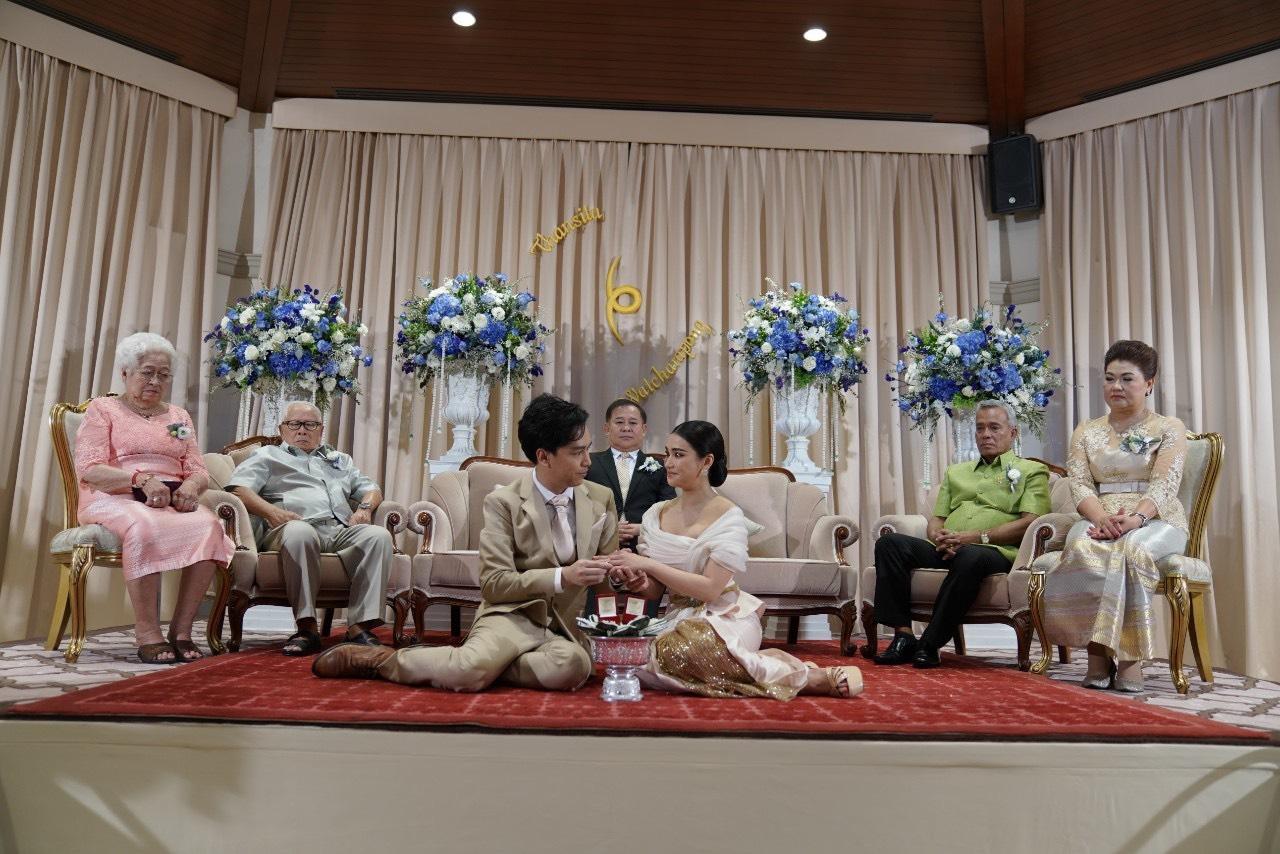 โดยมี ดร.ธัญญา โพธิ์วิจิตร หรือ เป็ด เชิญยิ้ม มีศักดิ์เป็นลุงของฝ่ายเจ้าบ่าว เป็นประธานในพิธี ซึ่งจัดขึ้นแบบเรียบง่าย มีเพียงญาติผู้ใหญ่ ญาติสนิทและเพื่อนในวงการมาร่วมงานประมาณ 50 คน อาทิ ธัญญ่า ธัญญาเรศ, หน่อง อรุโณชา, อาร์-อาณัตพล ศิริชุมแสง, ยิ่งยง ยอดบัวงาม, โย่ง เชิญยิ้ม, ตี๋ ดอกสะเดา, โบว์ เบญจศิริ, ปู้ เดอะสตาร์, จุ๊บจิ๊บ เชิญยิ้ม ฯลฯ มาร่วมแสดงความยินดี