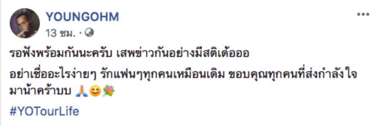 และเมื่อข่าวนี้ได้แพร่ออกไป ทางด้านแร็ปเปอร์ชื่อดัง ยังโอม ก็ได้ออกมาโพสต์เฟซบุ๊ก YOUNGOHM โดยบอกว่า ให้รอฟังพร้อมกัน และเสพข่าวอย่างมีสติ อย่าเชื่ออะไรง่ายๆ พร้อมกับขอบคุณทุกกำลังใจที่ส่งมาให้