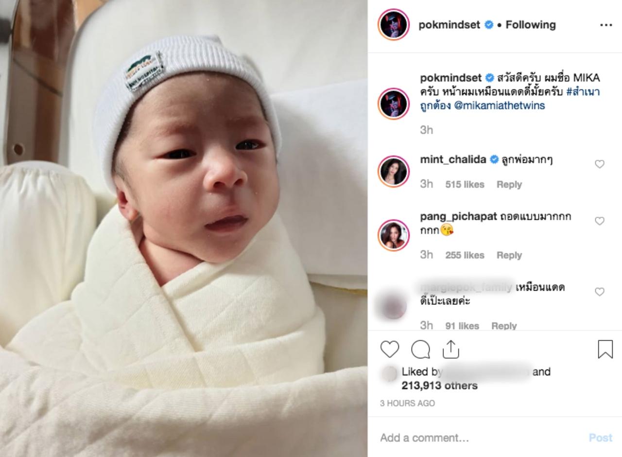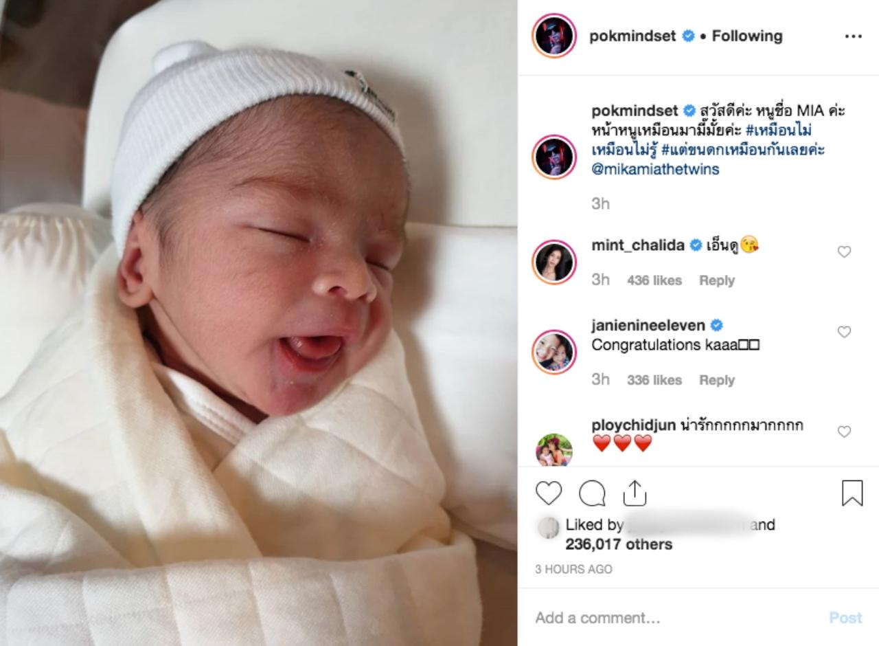 นอกจากนี้หนุ่มป๊อกได้โพสต์ภาพ ทั้งลูกชายและลูกสาว โดยมีข้อความว่า “สวัสดีครับ ผมชื่อ MIKA ครับ หน้าผมเหมือนแดดดี้ไหมครับ #สำเนาถูกต้อง @mikamiathatwins” และข้อความของรูปลูกสาว “สวัสดีค่ะ หนูชื่อ MIA ค่ะ หน้าหนูเหมือนมามี๊ไหมคะ #เหมือนไมเหมือนไม่รู้ #แต่ขนดกเหมือนกันเลยค่ะ @mikamiathetwins” เรียกได้ว่าแฟนๆต่างเอ็นดูในความน่ารักของน้องแฝดทั้งสอง เพราะเพียงไม่กี่ชั่วโมงแฟนคลับก็แห่ติดตามไอจีของน้องแฝดกว่าแสนคนแล้วจ้า ฮอตจริงๆลูกเอ๋ย