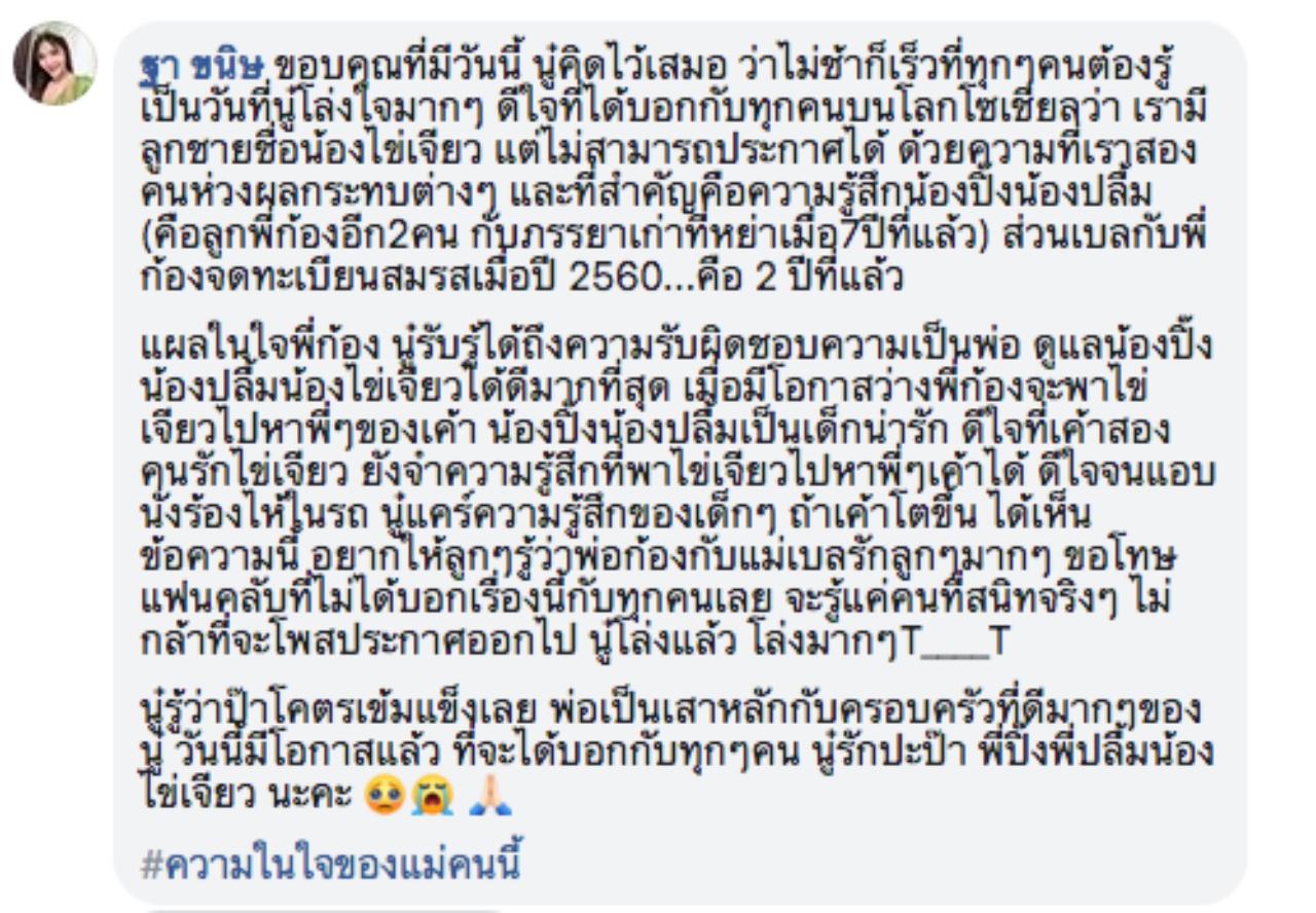 "ขอบคุณที่มีวันนี้ นู๋คิดไว้เสมอ ว่าไม่ช้าก็เร็วที่ทุกๆ คนต้องรู้ เป็นวันที่นู๋โล่งใจมากๆ ดีใจที่ได้บอกกับทุกคนบนโลกโซเชียลว่า เรามีลูกชายชื่อน้องไข่เจียว แต่ไม่สามารถประกาศได้ ด้วยความที่เราสองคนห่วงผลกระทบต่างๆ และที่สำคัญคือความรู้สึกน้องปิ๊งน้องปลื้ม (คือลูกพี่ก้องอีก 2 คน กับภรรยาเก่าที่หย่าเมื่อ 7 ปีที่แล้ว) ส่วนเบลกับพี่ก้องจดทะเบียนสมรสเมื่อปี 2560...คือ 2 ปีที่แล้ว