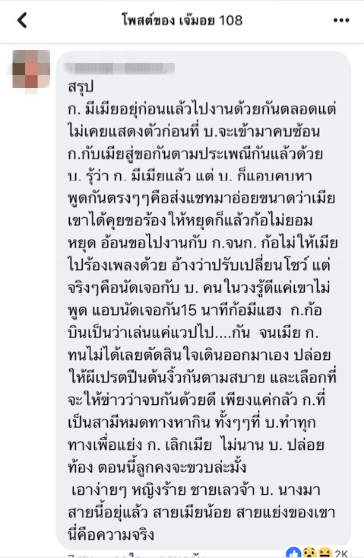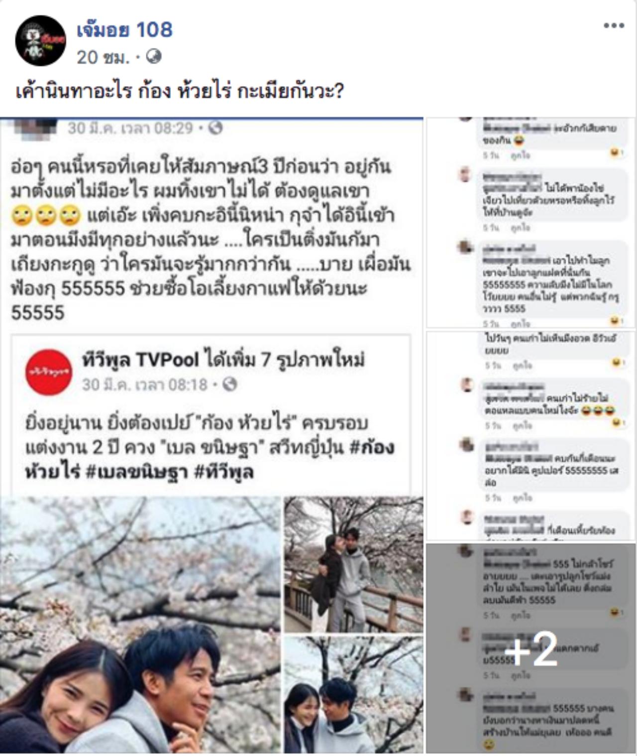 และเมื่อ เพจเจ๊มอย 108 ได้แคปโพสต์นั้นมาโพสต์ในเพจ ก็ทำให้หลายคนรู้สึกงงงวยเป็นอย่างมากว่านี้เป็นเรื่องจริงหรือไม่ และได้มีคนหนึ่งมาคอมเมนต์แฉก้องกับเบล โดยบอกว่า "สรุป ก. มีเมียอยู่ก่อนแล้วไปงานด้วยกันตลอดแต่ไม่เคยแสดงตัวก่อนที่ บ.จะเข้ามาคบซ้อน ก.กับเมียสู่ขอกันตามประเพณีกันแล้วด้วย