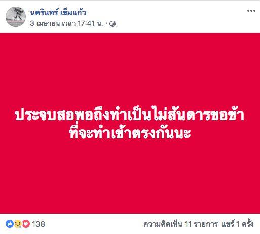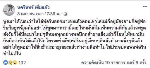 แต่หลังจากนั้นพ่อรินก็โพสต์ข้อความที่ใช้คำรุนแรงเพิ่มขึ้น โดยบอกว่า “พูดมาได้เนอะว่าไหไล่พ่อรินออกมาเอง แล้วตอนเขาไล่แม่ก็อยู่ น้องอามก็อยู่ พ่อรินก็อยู่พร้อมกัน อย่าให้พูดมากกว่านี้เลย ไหนๆมันก็ไม่เห็นความดีกันแล้วจะพูดยังไงก็ได้ นี้ละน่าใหม่ๆ ดีหมดทุกอย่าง พอปีกกล้าขาแข็งแล้วก็โยนให้หมามันกินถือว่าบินได้แล้วโว้ยใครจะทำไม พ่อรินอยู่เงียบๆ ดีแล้ว ทำงานนิ่งๆ ดีแล้ว อย่าให้พูดอย่าให้ขึ้น ข้านะอายุเยอะแล้วทำงานคือทำ ไม่ใช่ประจบสอพอ พ่อรินทำไม่เป็น” ก่อนจะโพสต์ข้อความดราม่าตามมาติดๆ อีกหลายโพสต์