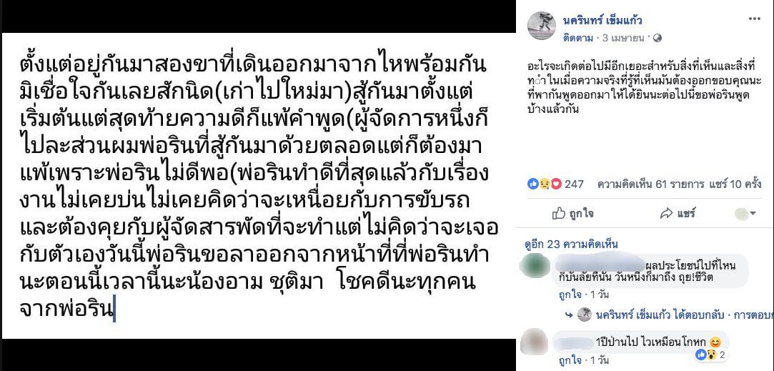 ตั้งแต่อยู่กันมาสองขาที่เดินออกมาจากไหพร้อมกัน มิเชื่อใจกันเลยสักนิด (เก่าไปใหม่มา) สู้กันมาตั้งแต่เริ่มต้น แต่สุดท้ายความดีก็พ่ายแพ้คำพูด ผู้จัดการหนึ่งก็ไปละส่วนผมพ่อรินที่สู้กันมาด้วยตลอด แต่ก็ต้องมาแพ้ เพราะพ่อรินไม่ดีพอ พ่อรินทำดีที่สุดแล้วกับเรื่องงาน ไม่เคยบ่นไม่เคยคิดว่าจะเหนื่อยกับการขับรถ และต้องคุยกับผู้จัดการสารพัดที่จะทำ แต่ไม่คิดว่าจะเจอกับตัวเอง วันนี้พ่อรินขอลาออกจากหน้าที่ที่พ่อรินทำนะ ตอนนี้เวลานี้นะน้องอาม ชุติมา โชคดีนะทุกคน จากพ่อริน”