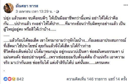 เริ่มจากหนึ่ง อัณศยา อดีตผู้จัดการส่วนตัวของอาม โพสต์ข้อความเป็นภาษาอีสาน ซึ่งแปลความได้ว่าไม่ได้ทำงานร่วมกับอาม ชุติมา ต่อแล้ว พร้อมทั้งบอกว่าขอให้จบกันดีๆ ให้เป็นมืออาชีพ และท้าให้เอาความจริงมาพูดกันด้วย โดยเจ้าตัวได้โพสต์ว่า “บ่ยุ่งแล้วนะคะ จบคือจบดีๆ ให้เป็นมืออาชีพกว่านี้แหน่ อย่าให้ได้เว่าคือกัน.....บ่ปากแล้ว กะอย่าให้ได้ปาก.....ทีมากะย้อนว่ารับผิดทุกอย่างแล้ว เป็นผู้ใหญ่อยู่คะ หรือสิให้เว่าบ้าง
