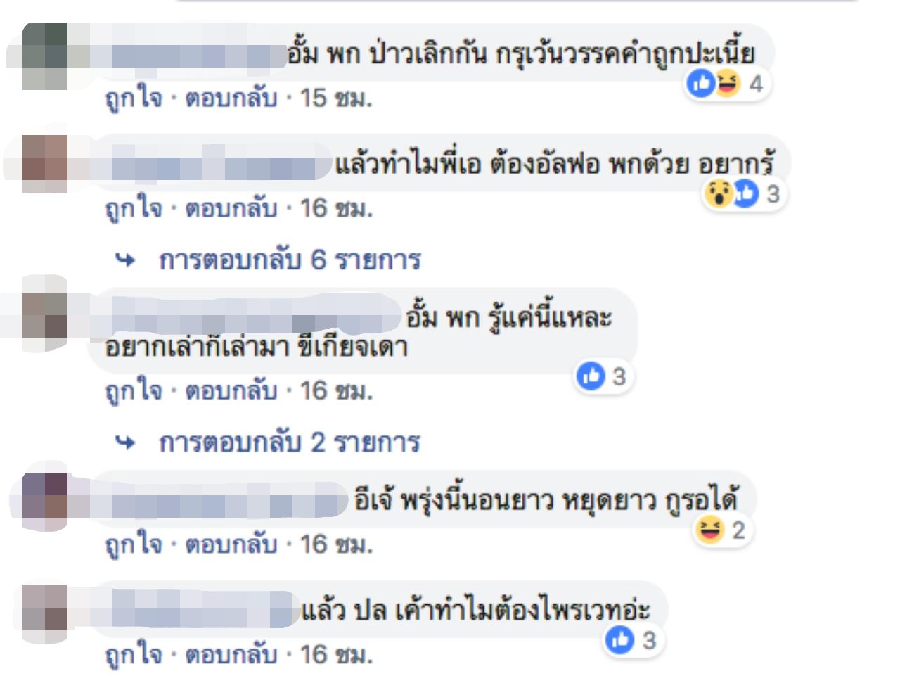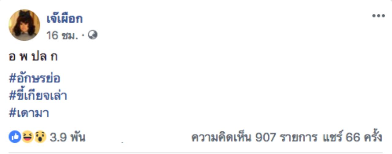 และล่าสุดใน เพจเจ๊เผือก ก็ได้โพสต์ขึ้นมาว่า "อ พ ปล ก #อักษรย่อ #ขี้เกียจเล่า #เดามา" งานนี้เลยทำเอาบรรดาขาเผือกของเจ๊เผือกตาสว่างขึ้นมากันเป็นแถว และหลายคนก็เริ่มเดาว่า อ พ ปล ก ที่โพสต์นั้นหมายถึงใคร โดยบางคนบอกว่า อั้ม พก ปุ๊กลุก กึ้ง หรือไม่ และบางคนก็ได้เข้าไปดูในอินสตาแกรมของ ปุ๊กลุก ฝนทิพย์ ปรากฏว่า ตัวปุ๊กลุกเองก็ได้ปิดอินสตาแกรมเช่นกัน งานนี้ยิ่งเพิ่มดีกรีความเผือกเข้าไปอีก แต่บางคนก็บอกว่า อาจจะไม่ใช่ก็ได้