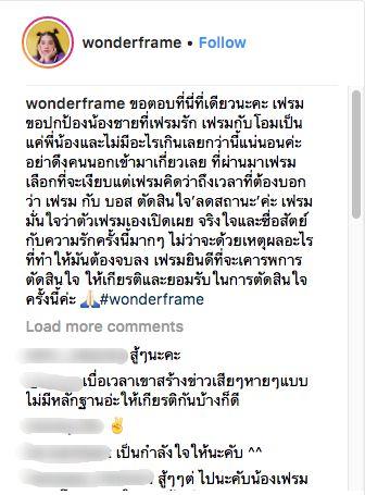 ที่ผ่านมาเฟรมเลือกที่จะเงียบแต่เฟรมคิดว่าถึงเวลาที่ต้องบอกว่า เฟรม กับ บอส ตัดสินใจ 'ลดสถานะ' ค่ะ เฟรมมั่นใจว่าตัวเฟรมเองเปิดเผย จริงใจและซื่อสัตย์กับความรักครั้งนี้มากๆ ไม่ว่าจะด้วยเหตุผลอะไรที่ทำให้มันต้องจบลง เฟรมยินดีที่จะเคารพการตัดสินใจ ให้เกียรติและยอมรับในการตัดสินใจครั้งนี้ค่ะ #wonderframe”
