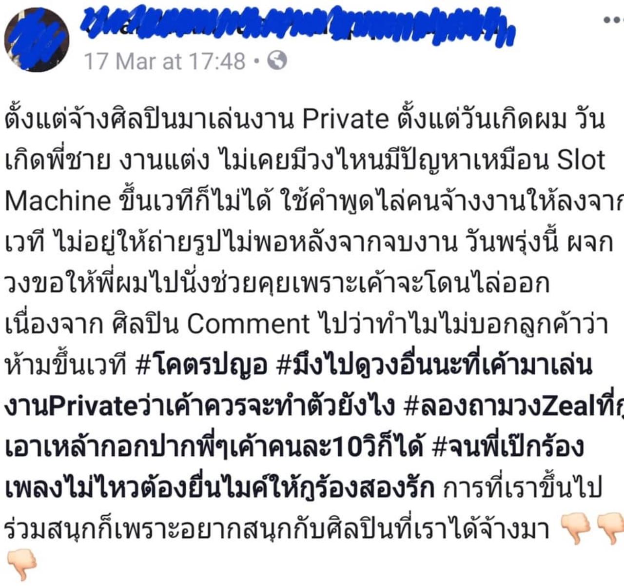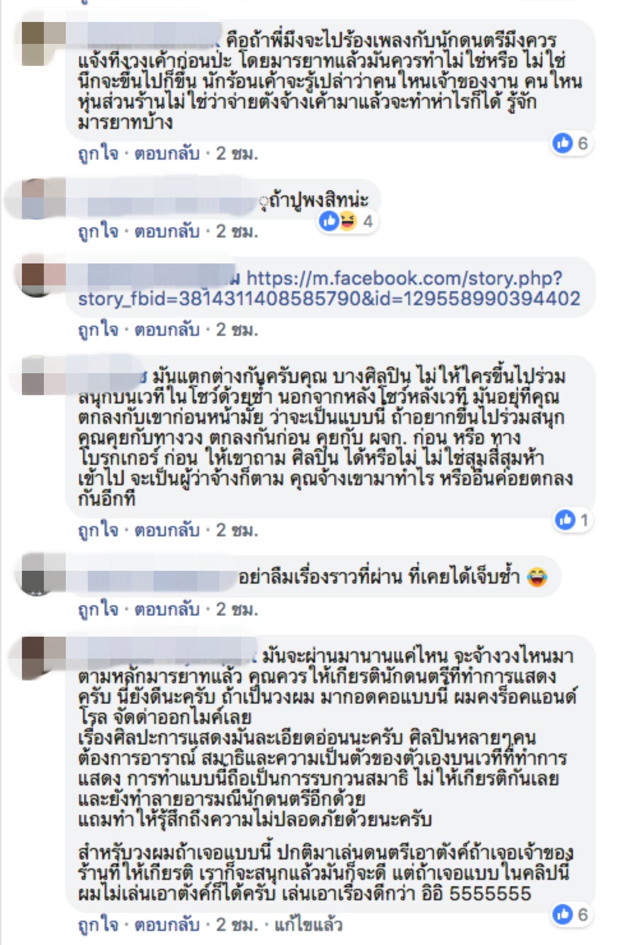 อย่างไรก็ตาม จากโพสต์ดังกล่าวมีคนเข้ามาแสดงความคิดเห็นมากมาย ซึ่งดูเหมือนว่าดราม่าครั้งนี้จะไม่จบง่ายๆ เพราะส่วนใหญ่เข้ามาแสดงความคิดเห็นว่า ทางฝั่งผู้จ้างงานควรให้เกียรติศิลปินด้วยเหมือนกัน