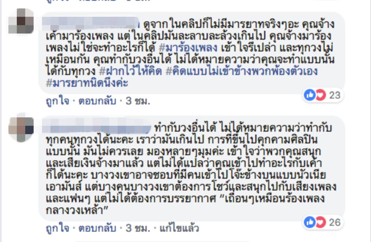 ซึ่งแฟนๆ ที่ติดตามก็ได้เข้ามาคอมเมนต์กันเป็นจำนวนมาก โดยทุกคนที่ได้เห็นคลิปนี้ต่างก็บอกเป็นเสียงเดียวกันว่า มารยาทแย่มาก และไม่ให้เกียรติศิลปินเลย