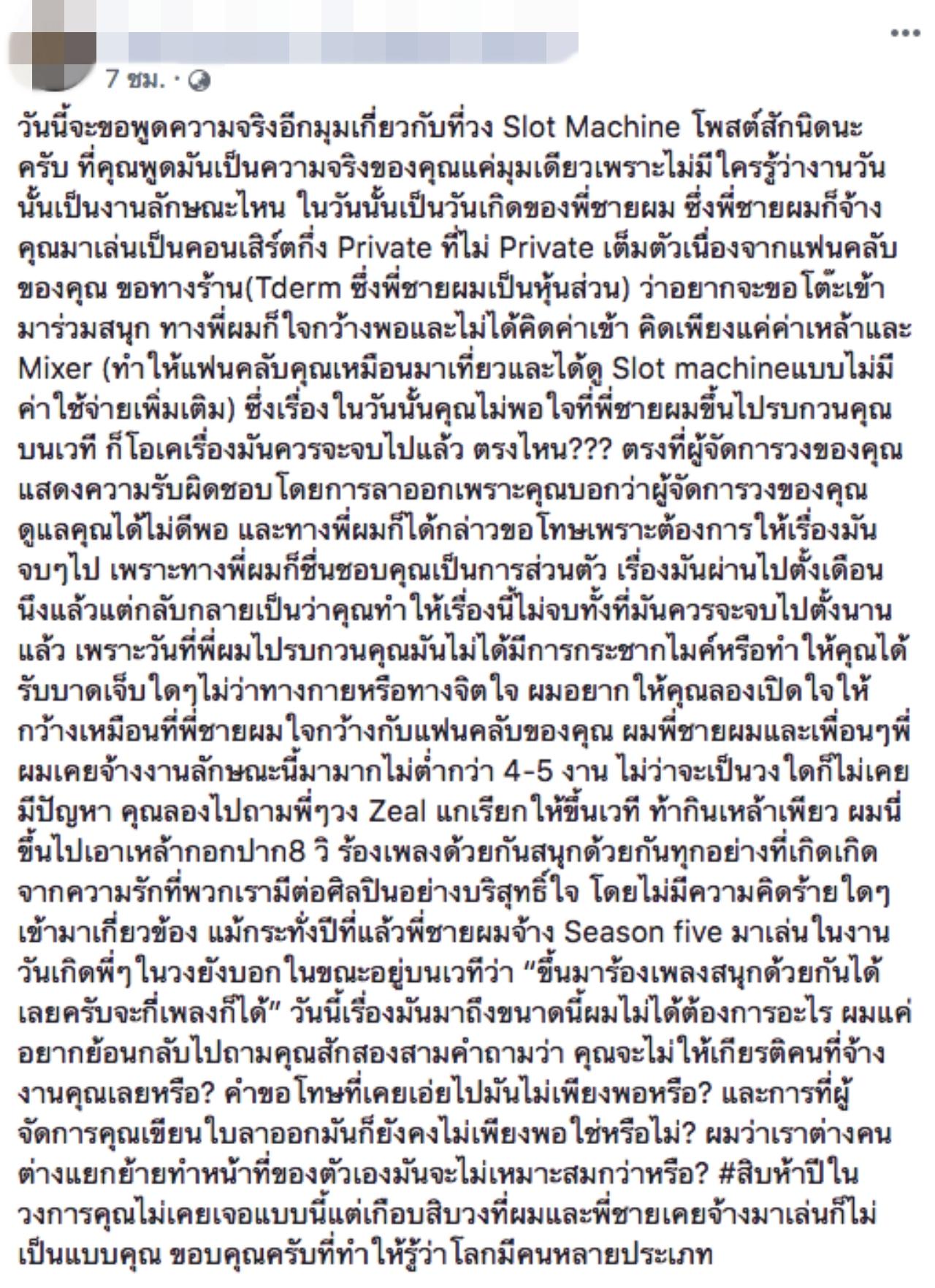 หลังจากที่ เฟิต ได้โพสต์คลิปนี้ออกไป ทางด้านของ คนที่อ้างว่าเป็นน้องชายของหุ้นส่วนร้าน ที่วง Slot Machine ไปเล่นคอนเสิร์ตก็ได้ขอชี้แจงอีกมุม โดยบอกว่า งานวันนั้นเป็นงานวันเกิดของพี่ชายตัวเอง ได้จ้างวง Slot Machine มาเล่นที่ร้านแบบกึ่งไพรเวต เพราะแฟนคลับได้ขอเข้ามาร่วมสนุกด้วย โดยที่ไม่เสียค่าเข้า