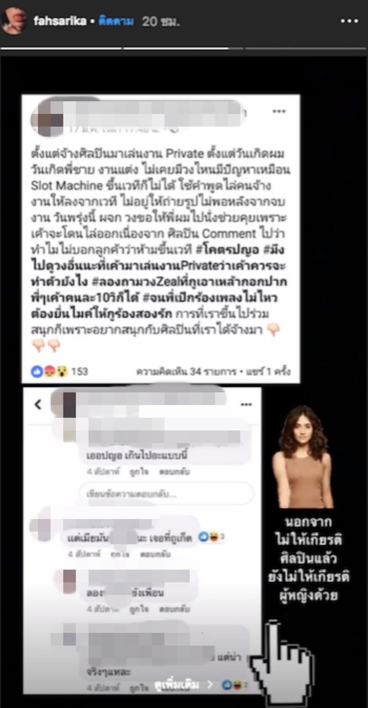 งานนี้เมื่อ ฟ้า ษริกา ได้เห็นเจ้าตัวเลยได้แคปภาพดังกล่าว และโพสต์ลงไอจีสตอรี่ของตัวเอง โดยบอกว่า "นอกจากจะไม่ให้เกียรติศิลปินแล้ว ยังไม่ให้เกียรติผู้หญิงอีกด้วย"