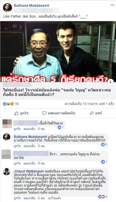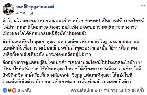 จากนั้นโจก็ได้เข้ามาคอมเมนต์ในลิงค์ข่าวที่ผู้กำกับดังโพสต์ในเฟซบุ๊กว่า “พ่อมันนี่เอง เคยทำประโยชน์เหี้_อะไรให้กับประเทศชาติบ้าง มึ_ตอบมาเลย พ่อกูเคยรับใช้ชาติ แบดมินตันไทยไประดับโลก ทำงานเสียภาษีจน Retired กูเองก็สร้างความบันเทิงทั้งดนตรี การแสดง และกีฬา ที่สำคัญรักชาติ ศาสน์ กษัตริย์ ไม่ส่งเสริมคนเลว นายมึ_หนีไปกี่ตัวแล้วอ่ะ คดีรถดับเพลิงอ่ะ รวยแล้วยังเสือโกงอย่างนั้นคนดีเหรอ กูนี่แหละออกตัวทางการเมืองเปิดหน้าชกแบบตรงๆ ไม่ต้องกวนตีนแบบมึ_”