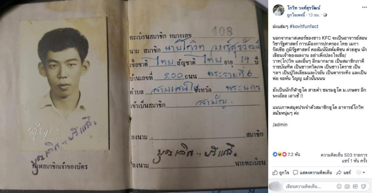 แน่นอนว่ากลายเป็นดราม่ายาวเหยียดตามมา เพราะหลังจากนั้นทางแอดมินแฟนเพจเฟซบุ๊ก โกวิท วงศ์สุรวัฒน์ ก็ได้โพสต์ภาพสมุดประจำตัวสมาชิกยูโดของ ดร.โกวิท เมื่อสมัยยังหนุ่ม พร้อมด้วยข้อความว่า “อ่ะแฮ่มๆ #kovitfunfact นอกจากมาสเตอร์ของชาว KFC จะเป็นอาจารย์สอนวิชารัฐศาสตร์ การเมืองการปกครอง ไทย เมกา รัสเซีย ภูมิรัฐศาสตร์ คอลัมน์นิสต์มติชน ต่วยตูน นักเขียนเจ้าของผลงาน อย่าเพิ่งปลงใจเชื่อ/วาท(โก)วิท และอื่นๆ อีกมากมาย