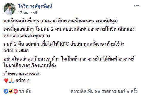 จากนั้นเกิดเสียงวิจารณ์ตามมาอีกระลอก บ้างก็เข้าใจผิดว่าเป็นทาง ดร.โกวิท โพสต์เอง จนทำให้แอดมินเพจคุณพ่อของจอห์นต้องออกมาชี้แจงอีกครั้งว่า “ขอเรียนแจ้งเพื่อทราบนะคะ (ดับความร้อนแรงของเพจนิสนุง) เพจนี้ดูแลหลักๆ โดยคน 2 คน คนแรกคือท่านอาจารย์โกวิท เขียนเอง ตอบเอง เล่นเองทุกอย่าง คนที่ 2 คือ admin เพื่อไม่ให้ KFC สับสน ทุกครั้งจะลงท้ายไว้ว่า admin เสมอ อย่างโพสต์ล่าสุด ก็ของเราน้าา ใจเย็นน้าา อาจารย์ไม่ได้พิมพ์ อาจารย์ไม่มาเสียเวลาเรื่องแบบนี้ค่ะ ด้วยความเคารพค่ะ admin”