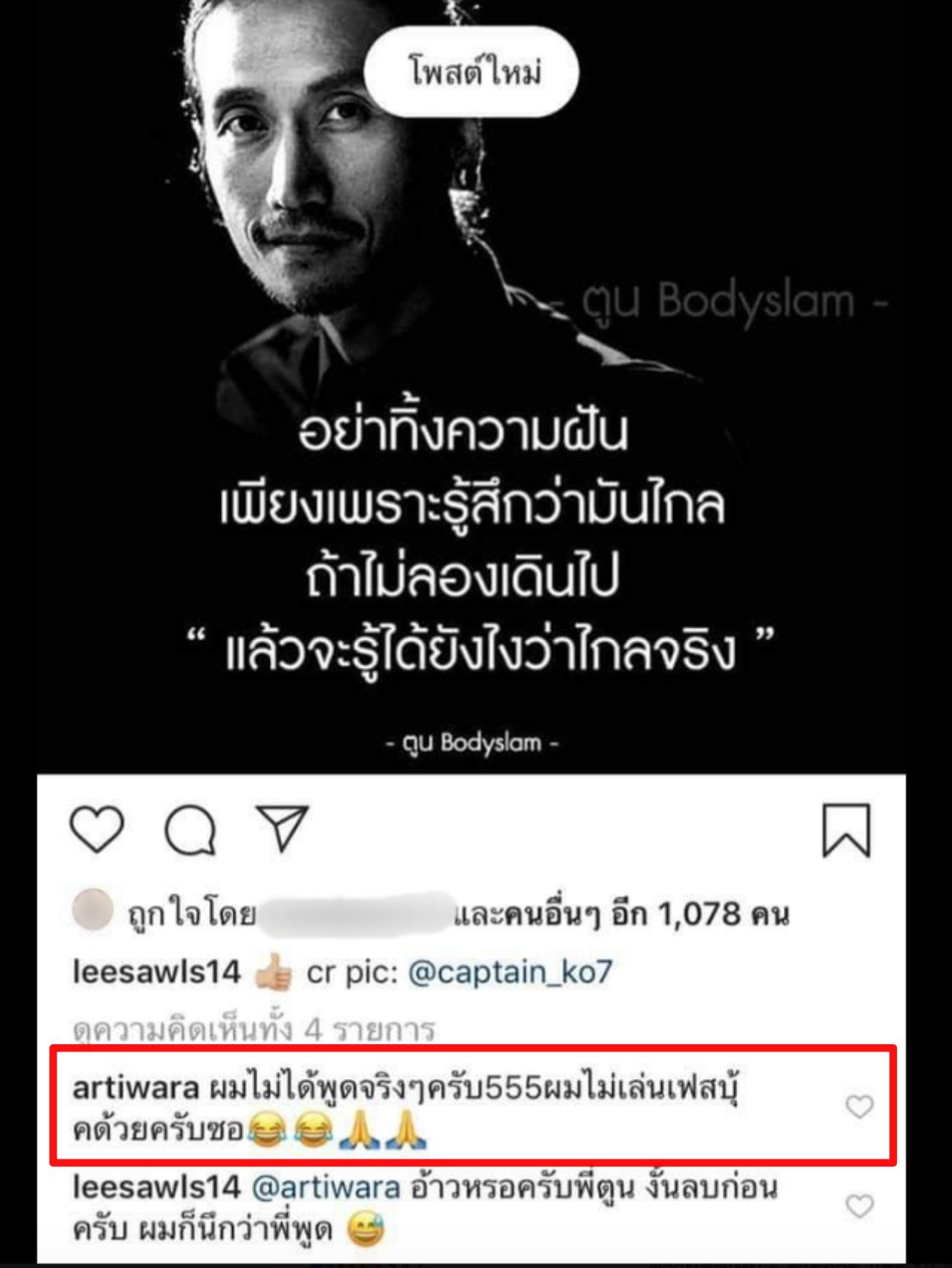 นอกจากนี้ ในเพจเฟซบุ๊ก พี่ตูน Bodyslam fc ได้โพสต์ภาพที่สร้างความขำขันให้กับแฟนๆ เป็นภาพของลีซอ นักฟุตบอลที่ได้แชร์ภาพ ตูน บอดี้สแลม พร้อมกับคำคม จน พี่ตูน ได้เข้ามาคอมเมนต์ตอบว่า "ผมไม่ได้พูดจริงๆ ครับ555 ผมไม่ได้เล่นเฟสบุ้คด้วยครับซอ"