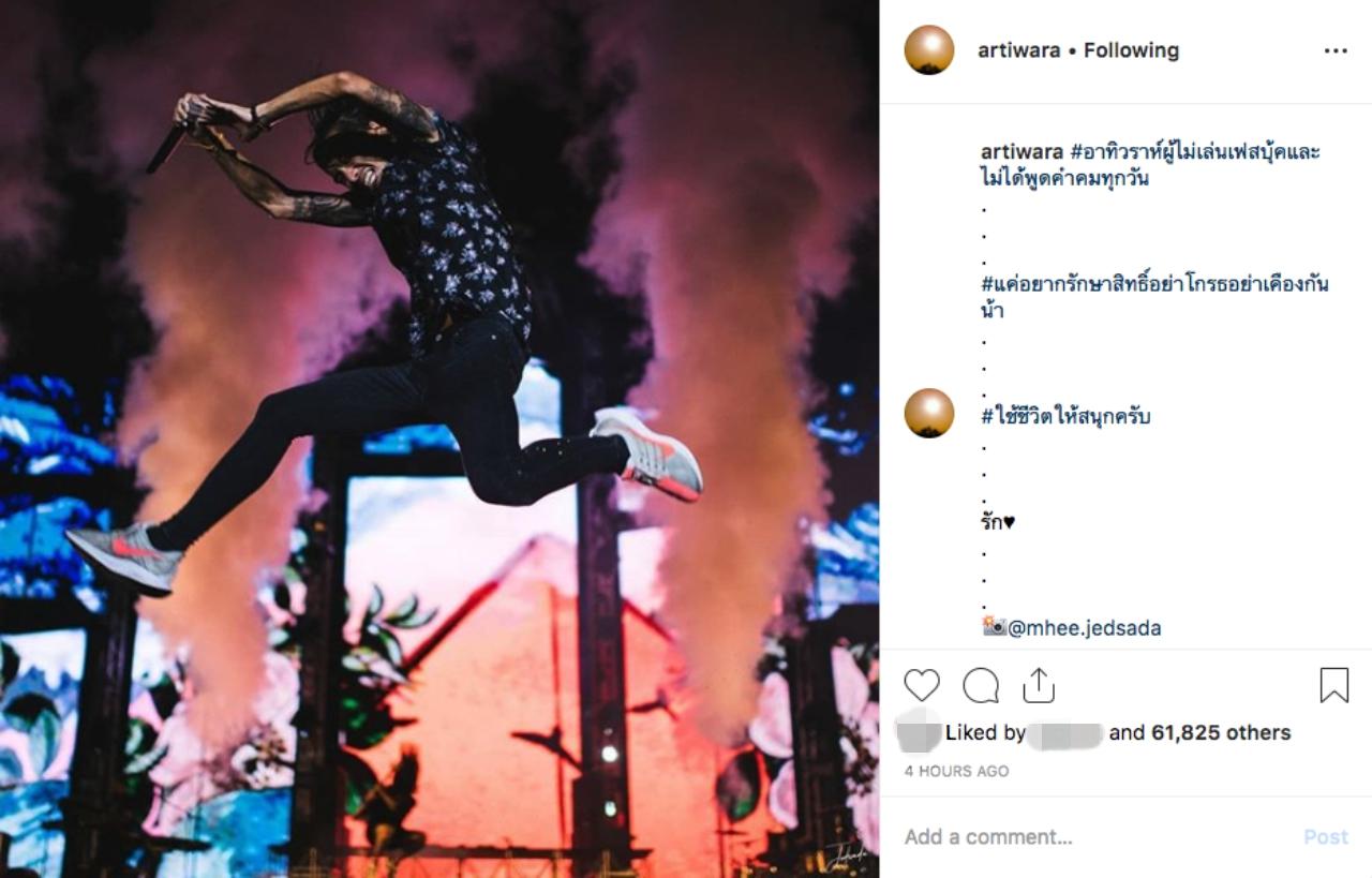 ล่าสุด พี่ตูนได้โพสต์ภาพลงอินสตาแกรมพร้อมแคปชั่นว่า "#อาทิวราห์ผู้ไม่เล่นเฟสบุ้คและไม่ได้พูดคำคมทุกวัน #แค่อยากรักษาสิทธิ์อย่าโกรธอย่าเคืองกันน้า #ใช้ชีวิตให้สนุกครับ รัก"