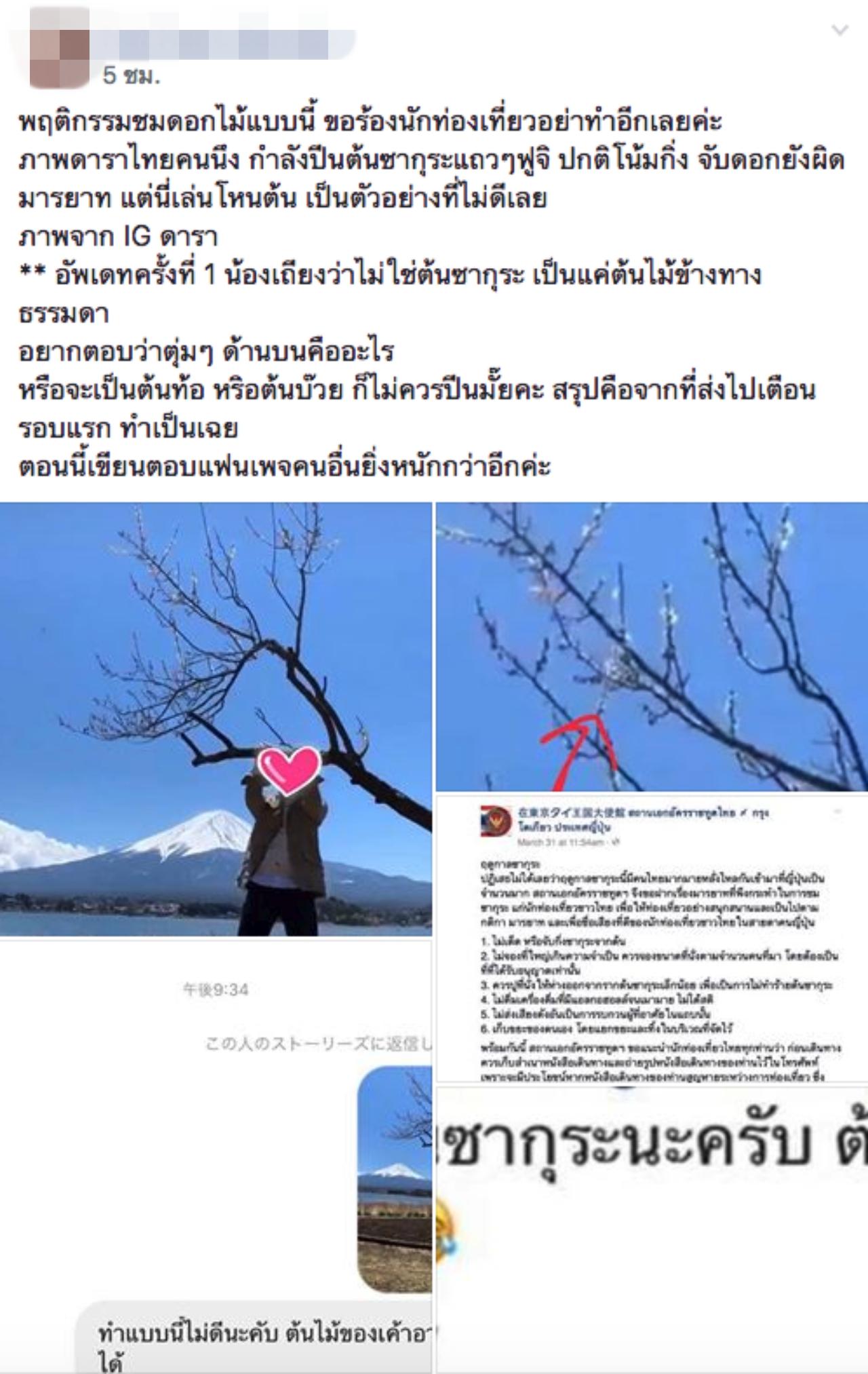 โดยได้มีสมาชิกของ กลุ่มแบ่งปันลายแทงของฝาก อาหาร ท่องเที่ยวฯ จากญี่ปุ่น ได้ลงเรื่องราวเหล่านี้ไว้ โดยเขียนบอกว่า "พฤติกรรมชมดอกไม้แบบนี้ ขอร้องนักท่องเที่ยวอย่าทำอีกเลยค่ะ ภาพดาราไทยคนนึง กำลังปีนต้นซากุระแถวๆ ฟูจิ ปกติโน้มกิ่ง จับดอกยังผิดมารยาท แต่นี่เล่นโหนต้น เป็นตัวอย่างที่ไม่ดีเลย ภาพจาก IG ดารา